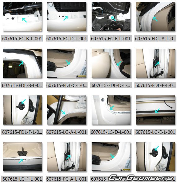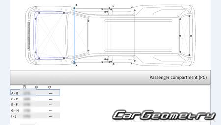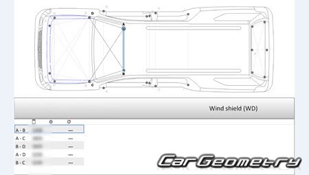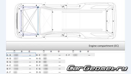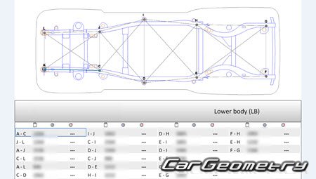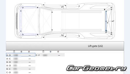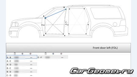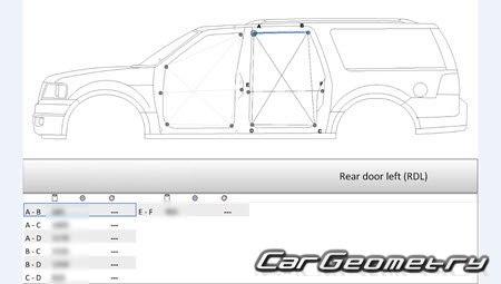 Body dimensions for restoring the body geometry of Lincoln Navigator L 2007–2014. With the help of this information, you can check the geometry of the damaged body, as well as carry out restoration work on the straightening of cars.