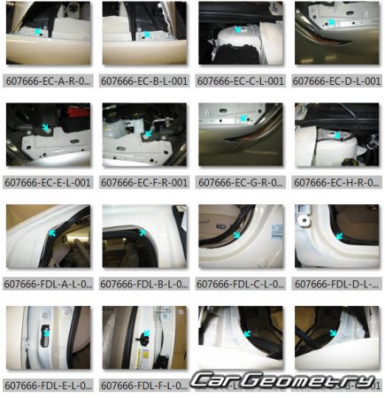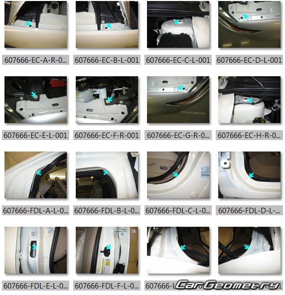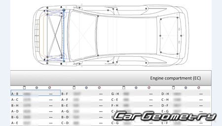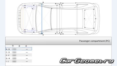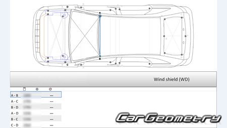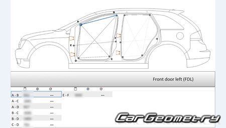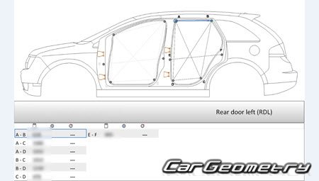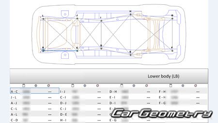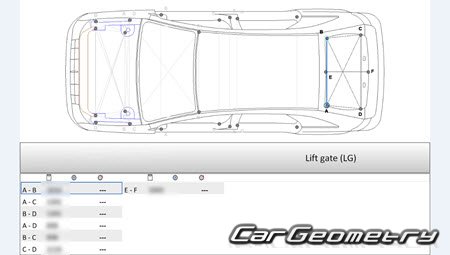 Body dimensions for restoring the body geometry of Lincoln MKX (U388) 2011-2015. With the help of this information, you can check the geometry of the damaged body, as well as carry out restoration work on the straightening of cars.