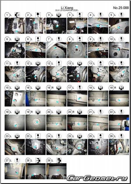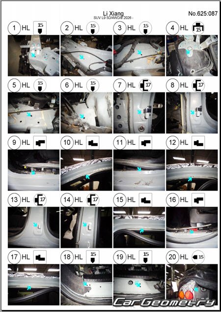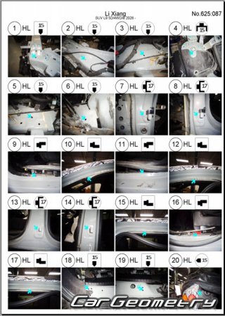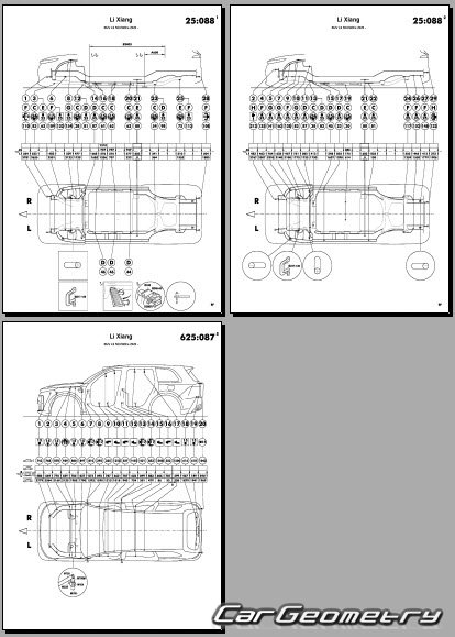Body dimensions for restoring the body geometry of Li Xiang L9 from 2026. With the help of this information, you can check the geometry of the damaged body, as well as carry out restoration work on the straightening of cars.