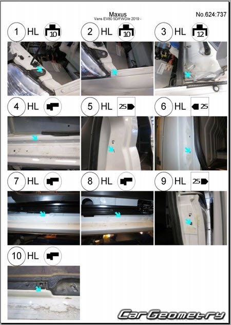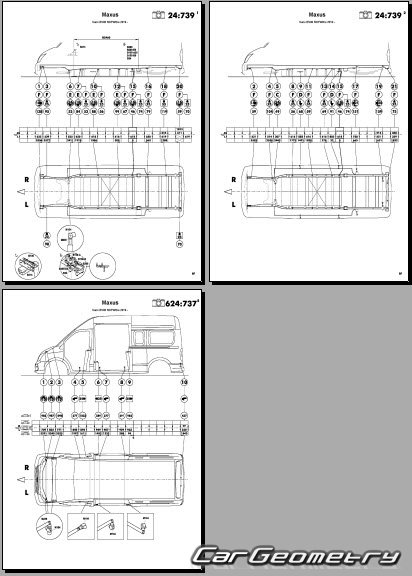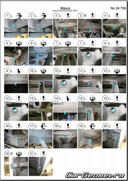 Body dimensions for restoring the body geometry of Maxus EV80 2019-2026. With the help of this information, you can check the geometry of the damaged body, as well as carry out restoration work on the straightening of cars. In various markets, the car is sold as SAIC Maxus EV80 and LDV EV80 since 2019.