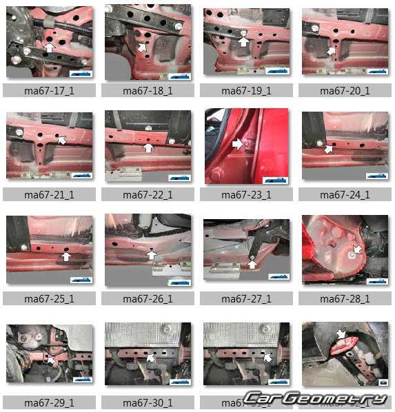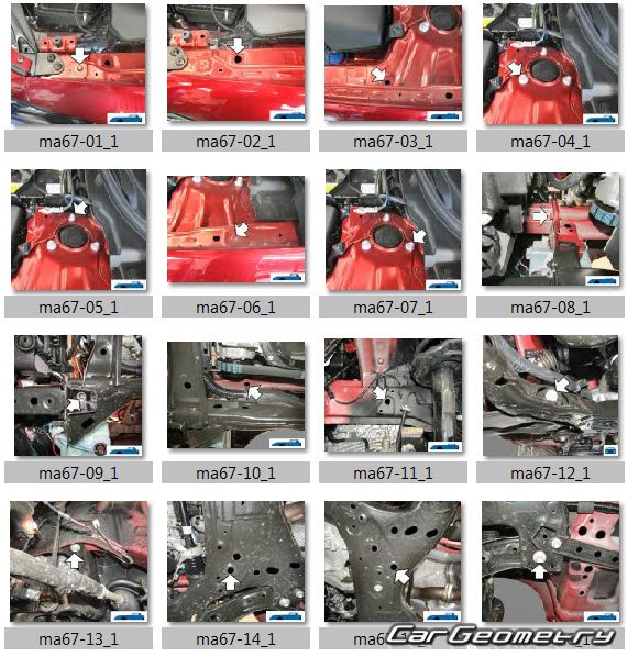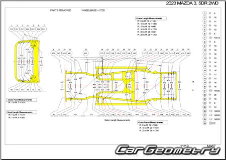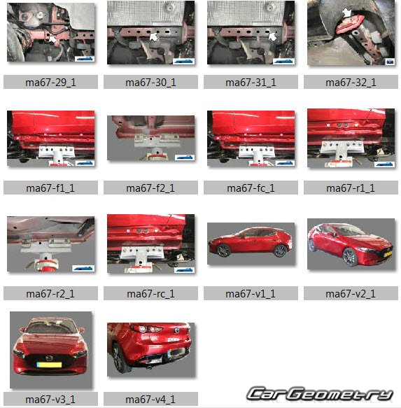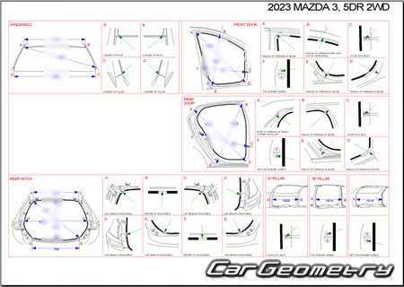 Body dimensions for restoring the body geometry of Mazda 3 Hatchback (BP) 2019-2025. With the help of this information, you can check the geometry of the damaged body, as well as carry out restoration work on the straightening of cars.