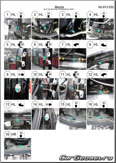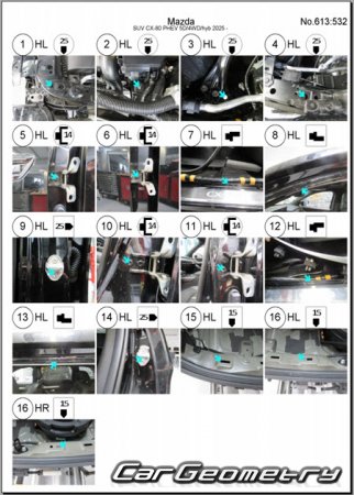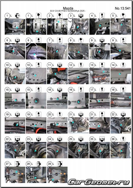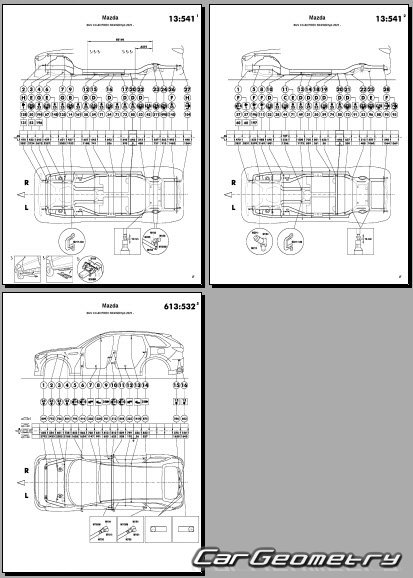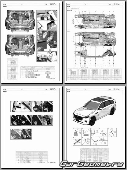 Body dimensions for restoring the body geometry of Mazda CX-80 (KL) 2024-2030 vehicles. These data are used for checking the body geometry and subsequent straightening of damaged parts of Mazda cars. These measurements are specifically applicable to the right-hand drive versions of Mazda CX-80 (KL) 2024-2030 for the Japanese market.