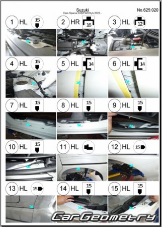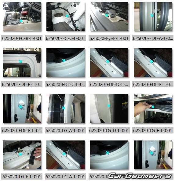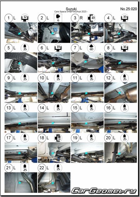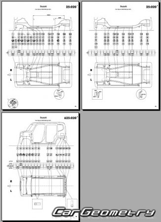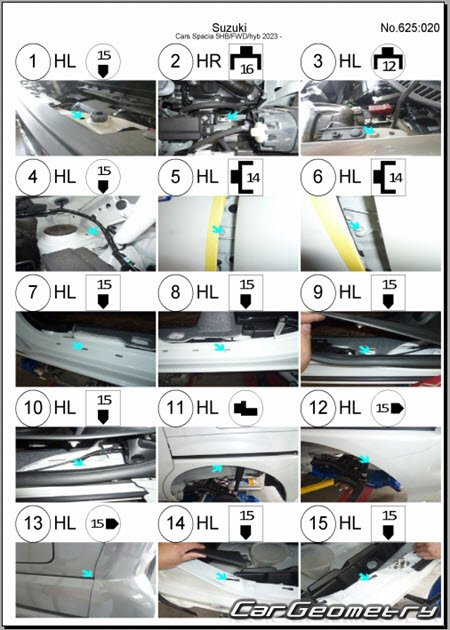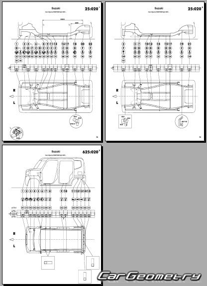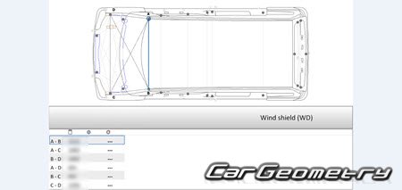 Body dimensions for restoring the body geometry of Mazda Flair Wagon (MM54S MM94S) 2023-2028 vehicles. These data are used for checking the body geometry and subsequent straightening of damaged parts of Mazda cars. These measurements are specifically applicable to the right-hand drive versions of Mazda Flair Wagon and Flair Wagon Custom for the Japanese market.