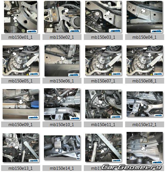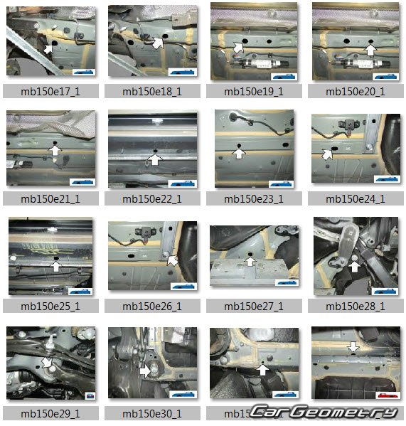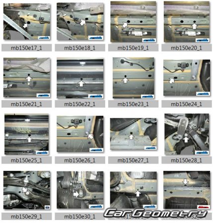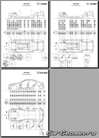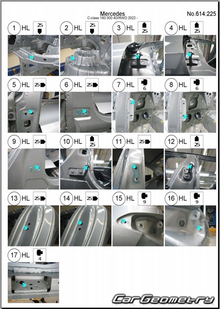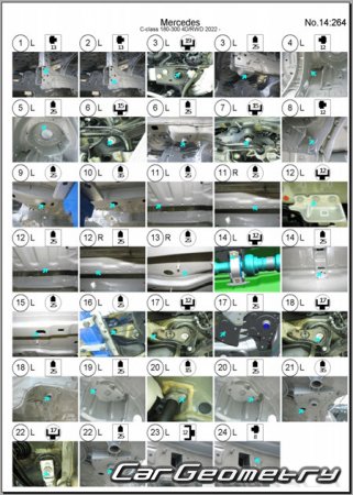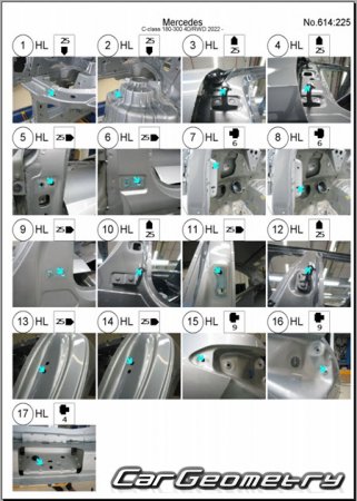 Body dimensions for restoring the body geometry of Mercedes C-Class Sedan (W206) from 2022. With the help of this information, you can check the geometry of the damaged body, as well as carry out restoration work on the straightening of cars.