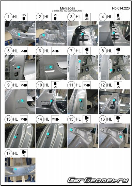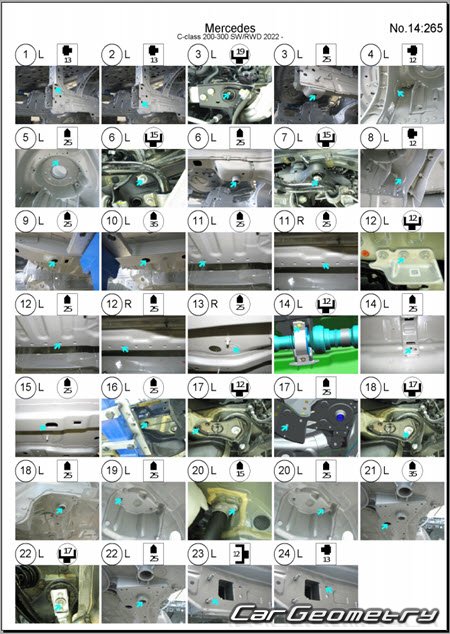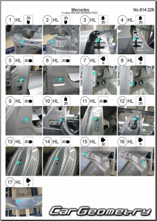 Body dimensions for restoring the body geometry of Mercedes C-Class Estate (S206) from 2022. With the help of this information, you can check the geometry of the damaged body, as well as carry out restoration work on the straightening of cars.