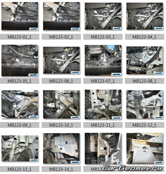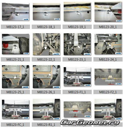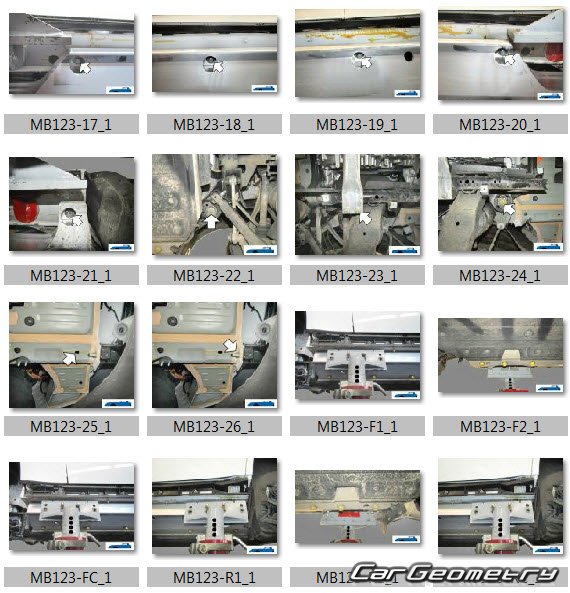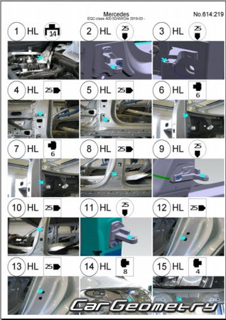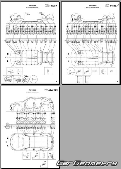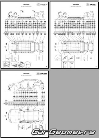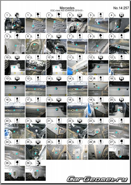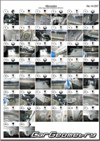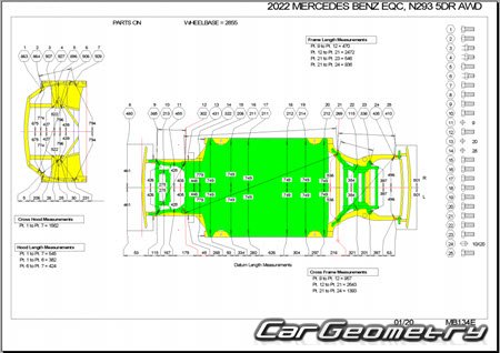 Body dimensions for restoring the body geometry of Mercedes EQC-Class (N293) From 2019. With the help of this information, you can check the geometry of the damaged body, as well as carry out restoration work on the straightening of cars.