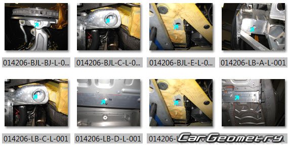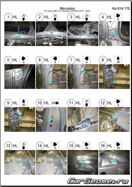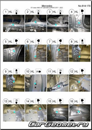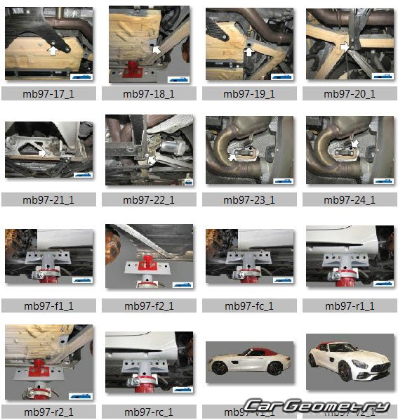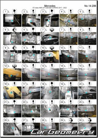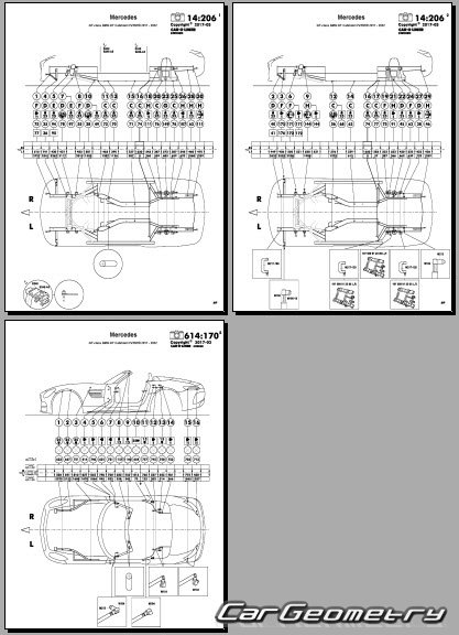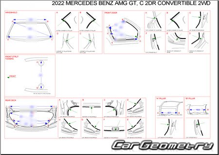 Body dimensions for restoring the body geometry of Mercedes AMG GT Roadster (R190) 2017-2022. With the help of this information, you can check the geometry of the damaged body, as well as carry out restoration work on the straightening of cars.