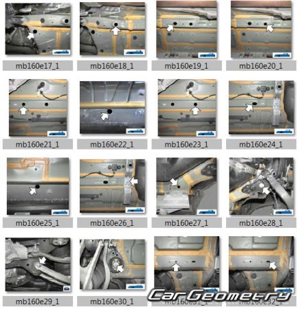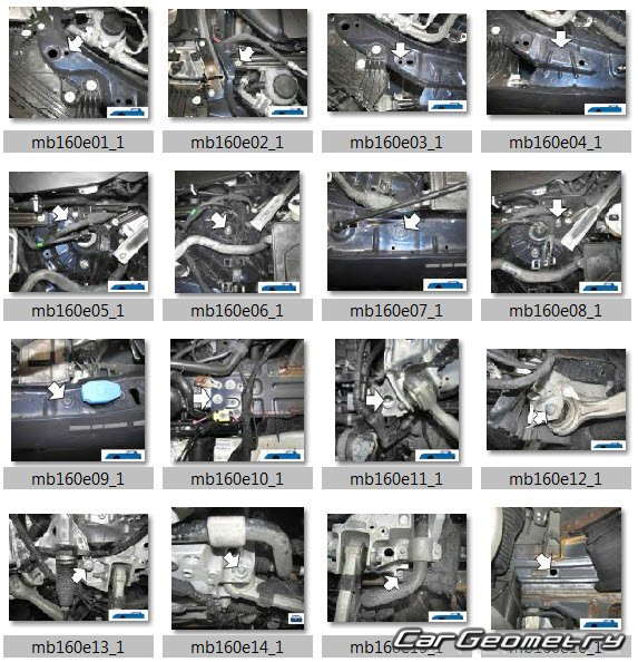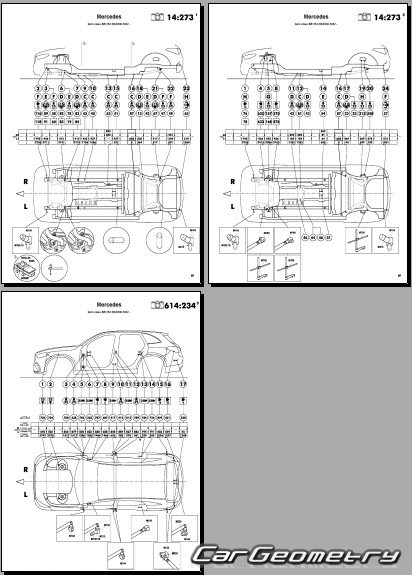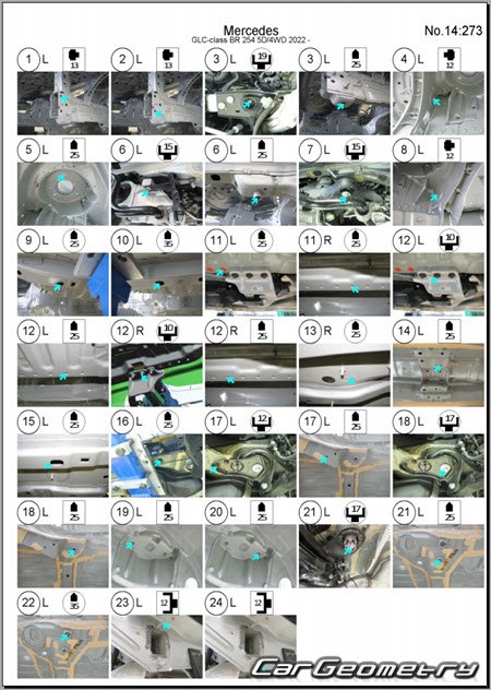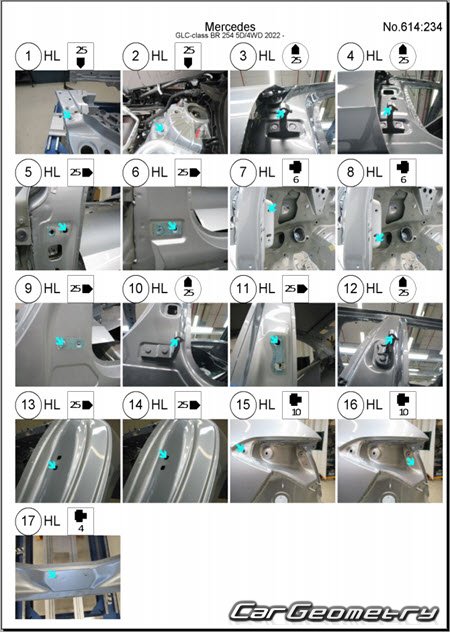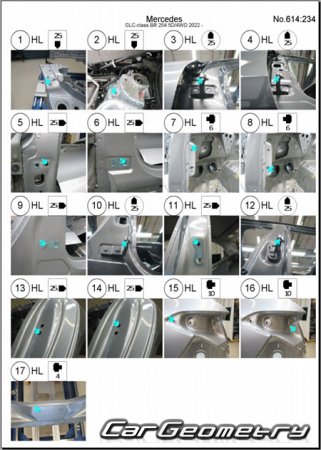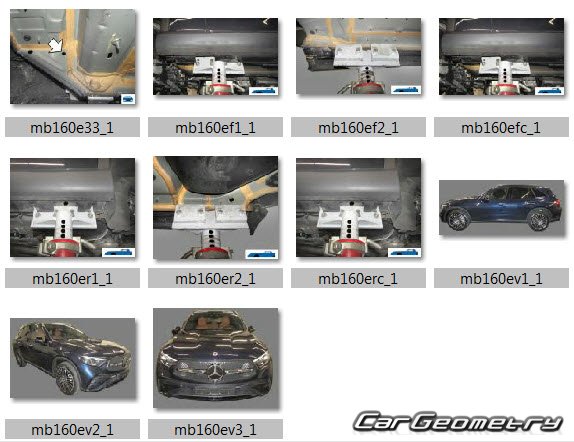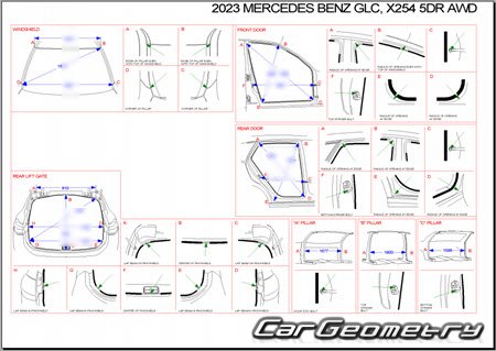Body dimensions for restoring the body geometry of Mercedes GLC-Class (X254) 2022–2028. With the help of this information, you can check the geometry of the damaged body, as well as carry out restoration work on the straightening of cars.