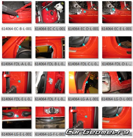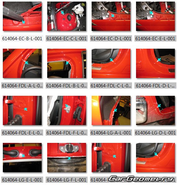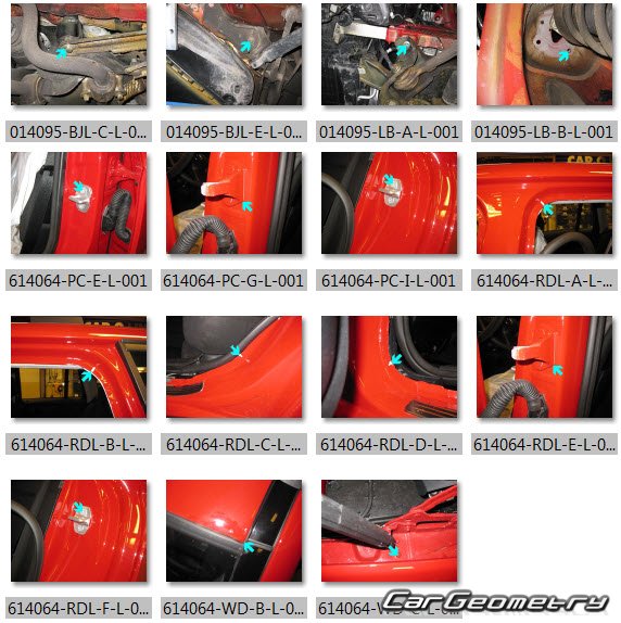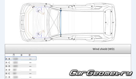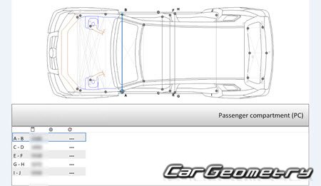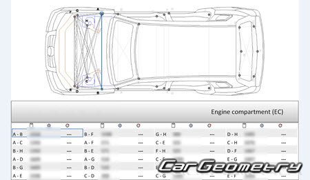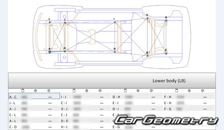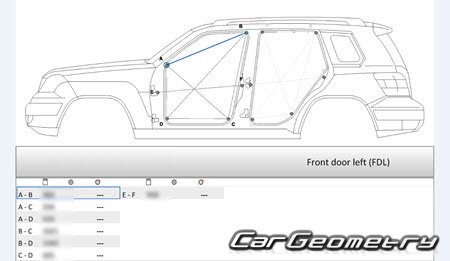 Body dimensions for restoring the body geometry of Mercedes GLK-Class (X204) 2008-2012. With the help of this information, you can check the geometry of the damaged body, as well as carry out restoration work on the straightening of cars.