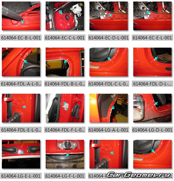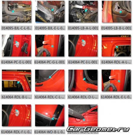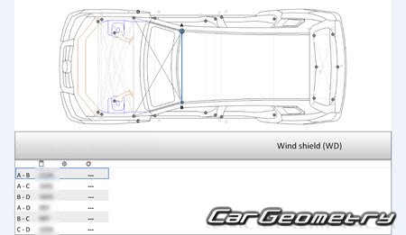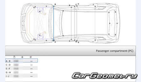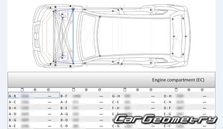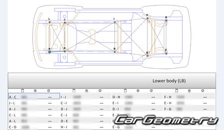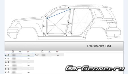 Body dimensions for restoring the body geometry of Mercedes GLK-Class (X204) 2013-2015. With the help of this information, you can check the geometry of the damaged body, as well as carry out restoration work on the straightening of cars.