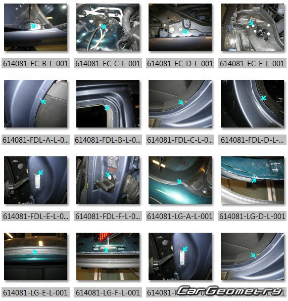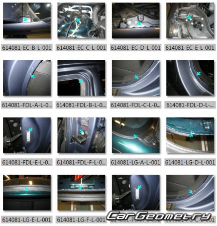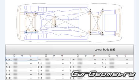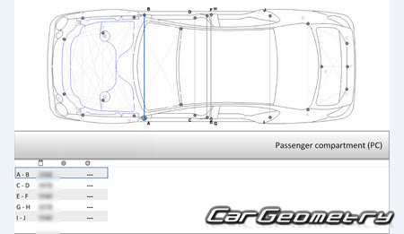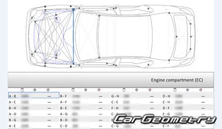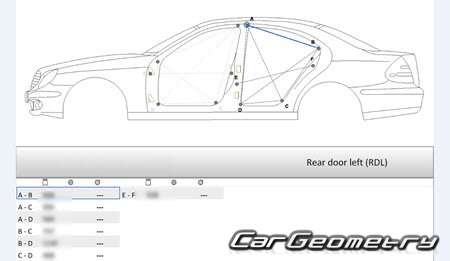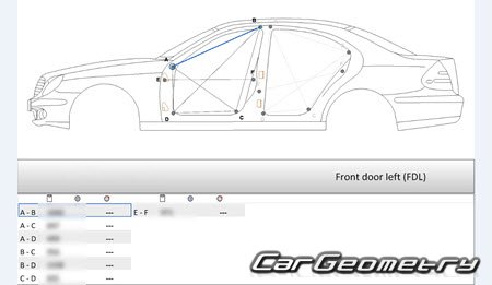 Body dimensions for restoring the body geometry of Mercedes E-Class Sedan (W211) 2002–2009. With the help of this information, you can check the geometry of the damaged body, as well as carry out restoration work on the straightening of cars.