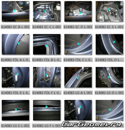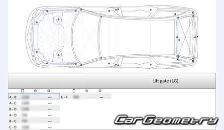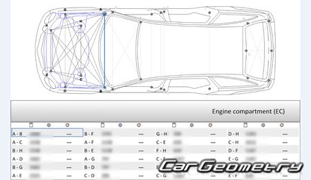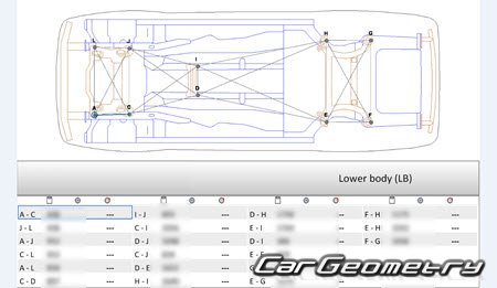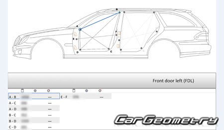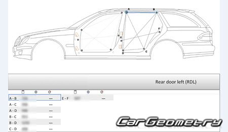 Body dimensions for restoring the body geometry of Mercedes E-Class Estate (S211) 2003–2009. With the help of this information, you can check the geometry of the damaged body, as well as carry out restoration work on the straightening of cars.