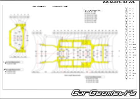 The factory manual provides the body dimensions for the MG EHS & HS 2019-2025, including descriptions of replacement procedures for various body components and the body dimensions and control points for the MG EHS & HS body geometry.