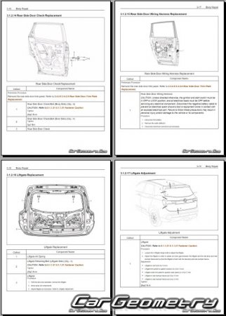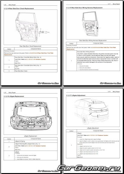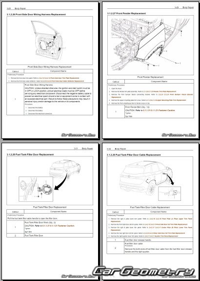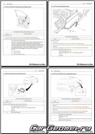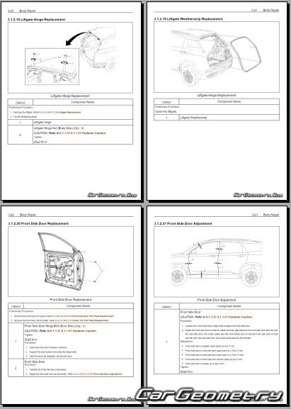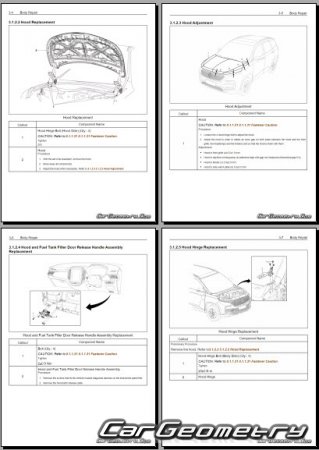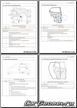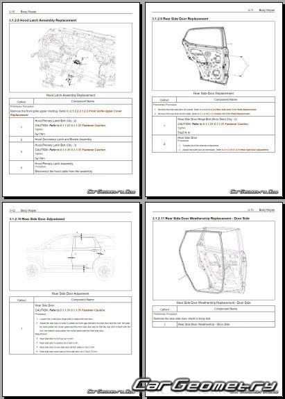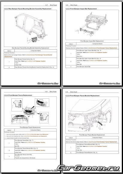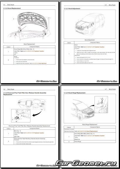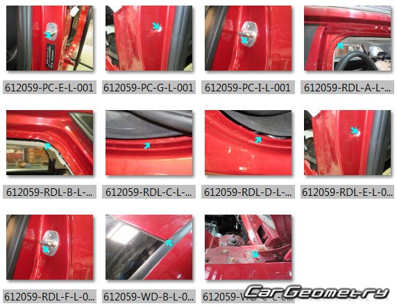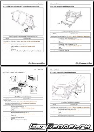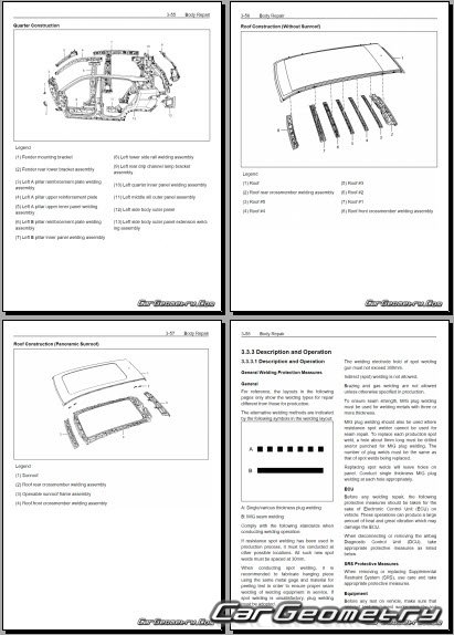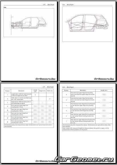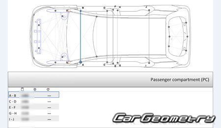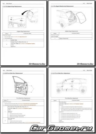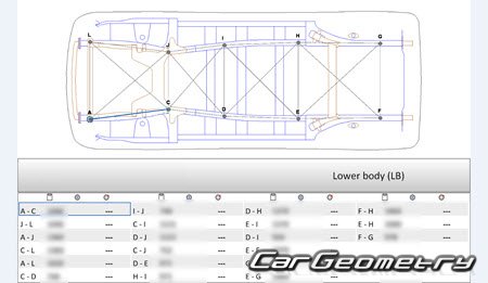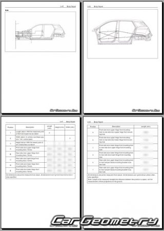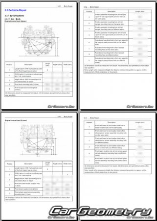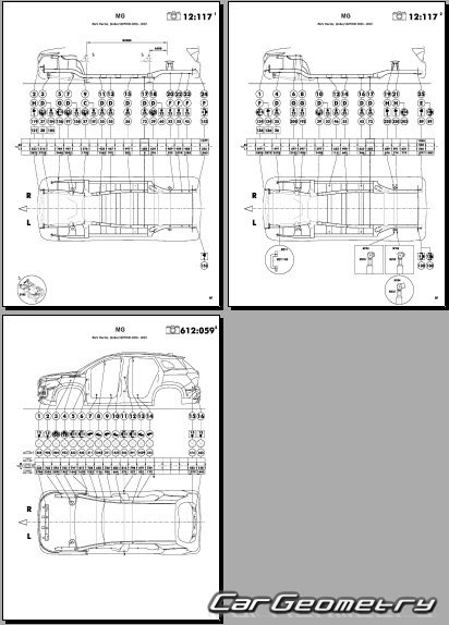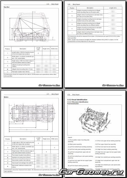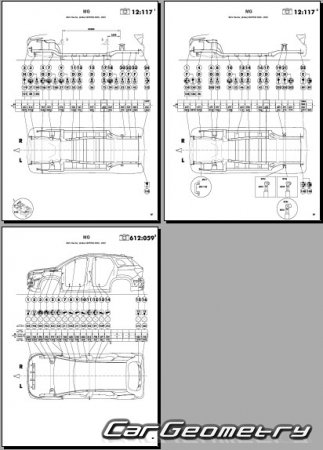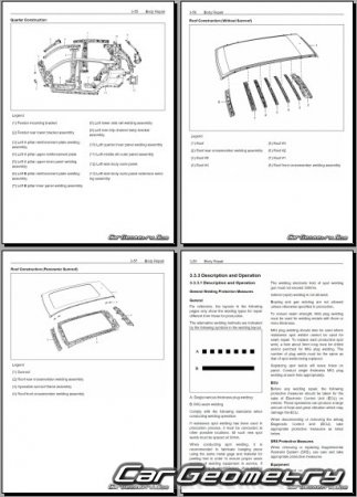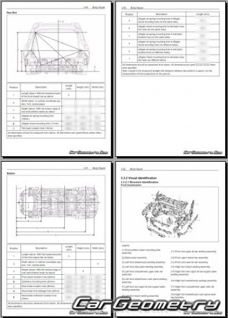 The information included in the manual consists of body dimensions, control points, sectional images of body elements, applicable materials, recommendations for welding types, methods, and materials, locations and materials for applying seals, sound insulation, and anti-corrosion sealants, areas and directions for cutting body elements for subsequent installation of new parts, interior material types, and decoding of markings.