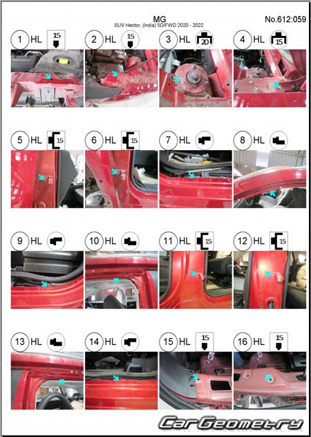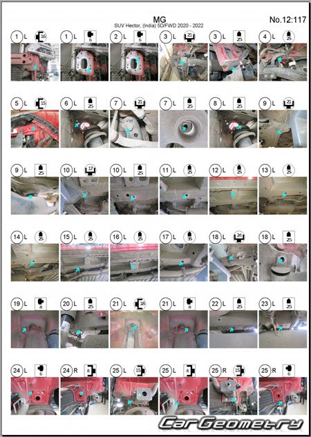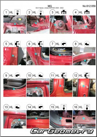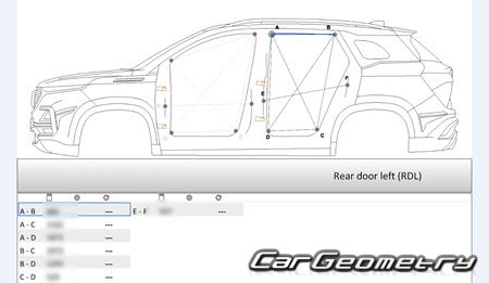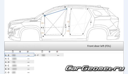 The factory manual provides the body dimensions for the MG Hector 2020-2023, including descriptions of replacement procedures for various body components and the body dimensions and control points for the MG Hector body geometry. The MG Hector model is a global SAIC-GM Wuling platform, sold under different brands with minimal changes: Baojun 530 (China), Wuling Almaz (Indonesia), Chevrolet Captiva (South America, Thailand), MG Hector (India).
