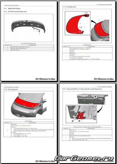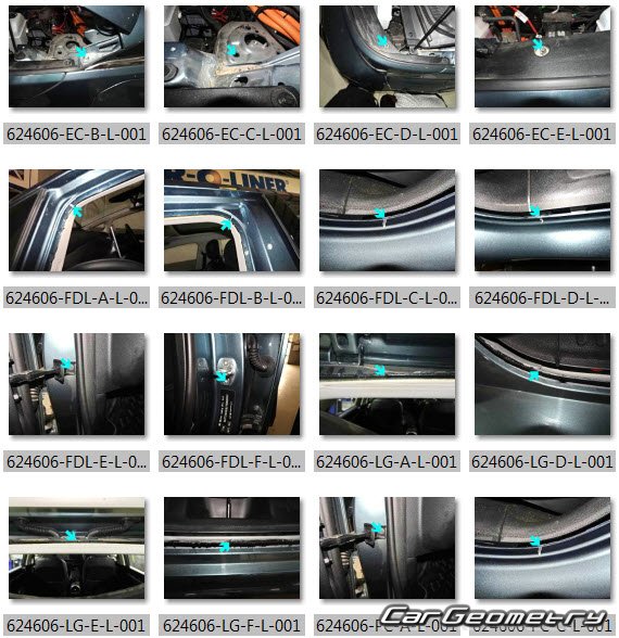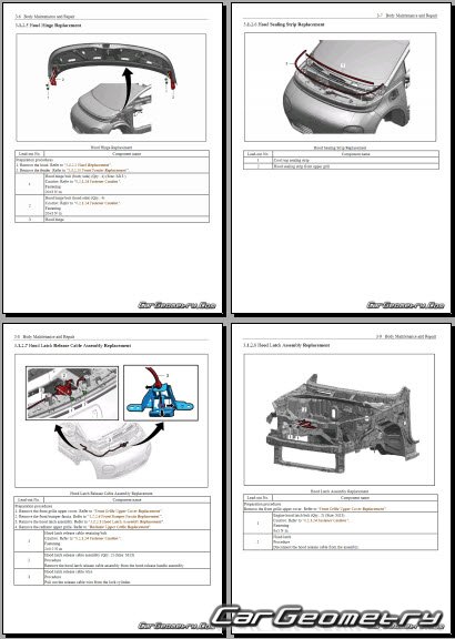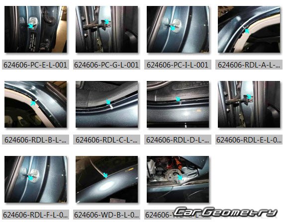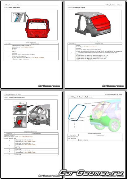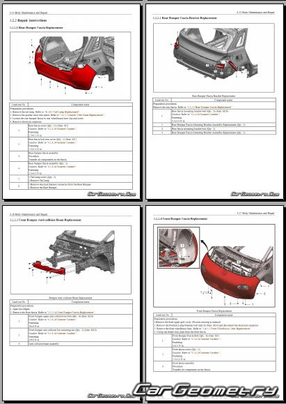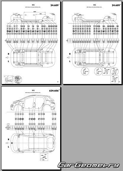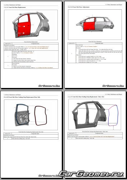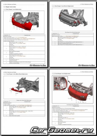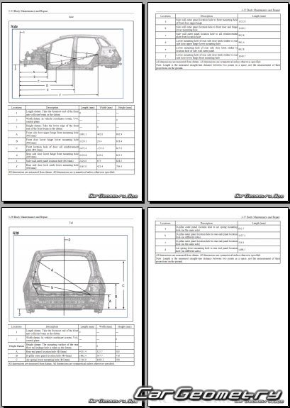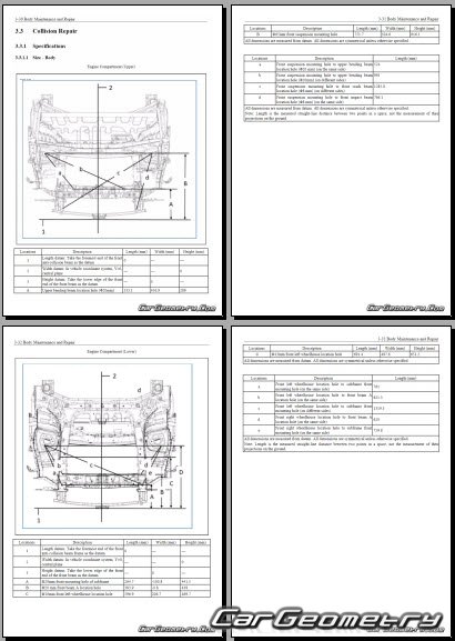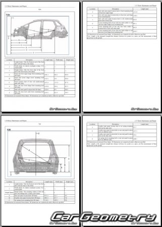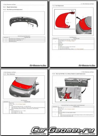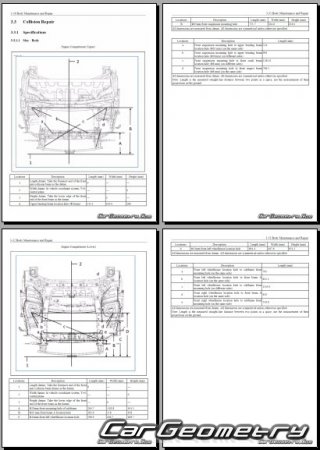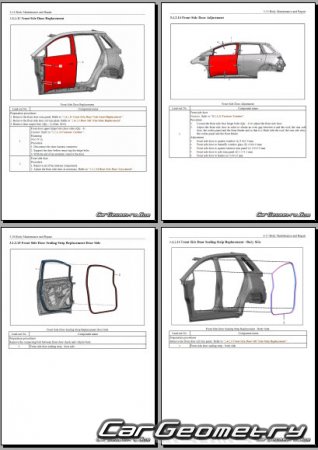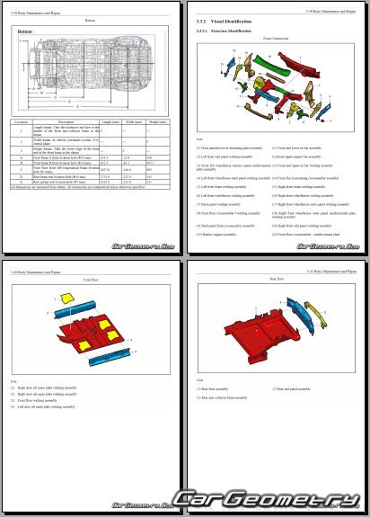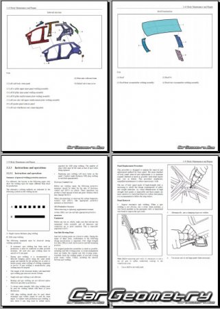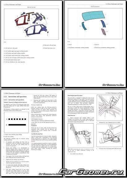 The information included in the manual consists of body dimensions, control points, sectional images of body elements, applicable materials, recommendations for welding types, methods, and materials, locations and materials for applying seals, sound insulation, and anti-corrosion sealants, areas and directions for cutting body elements for subsequent installation of new parts, interior material types, and decoding of markings.