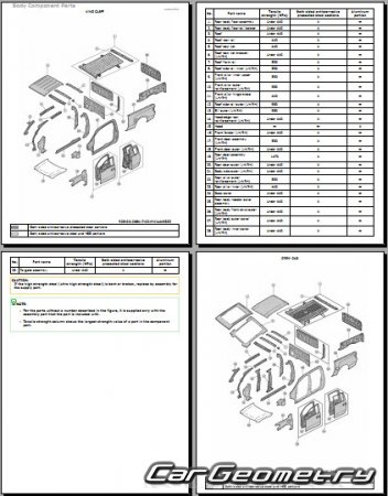 Information for the Nissan Titan (Crew Cab & King Cab) 2016-2020 body geometric dimensions, control points, images of body elements, materials used, recommendations on applicable types, methods and materials for the welding points; places and materials for applying seam, soundproof and anti-corrosion sealants; points and directions for pre-cuts of body parts for the future installation of the new ones; types of interior materials, definitions and decoding.