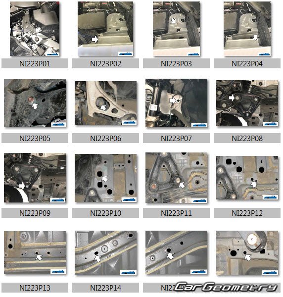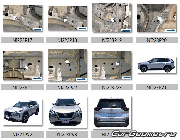 Body dimensions for restoring the body geometry of Nissan X-Trail e-POWER (T33) 2023-2027 are used for checking the body geometry and subsequent straightening of damaged parts of Nissan X-Trail right-hand drive vehicles.