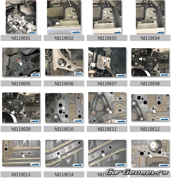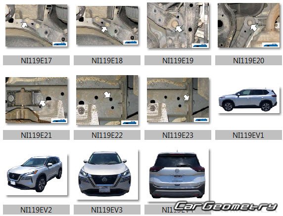 The factory manual contains body dimensions for the Nissan X-Trail e-POWER (T33) 2023-2027 Body Repair Manual, including descriptions for replacing various body elements of the T33, as well as body dimensions and control points for the body geometry of the Nissan X-Trail.