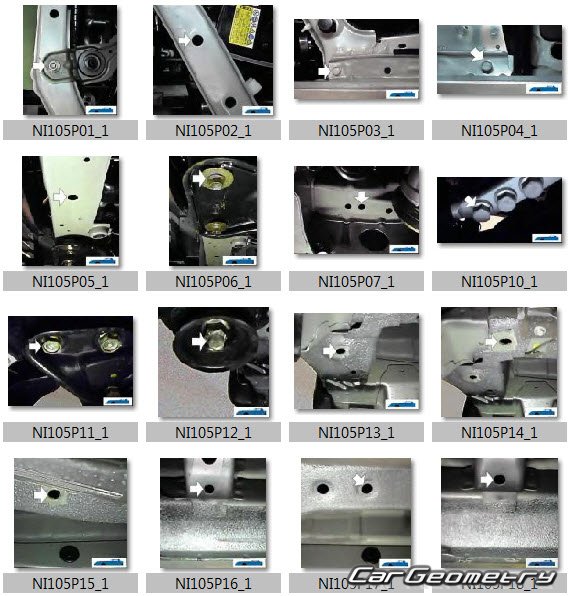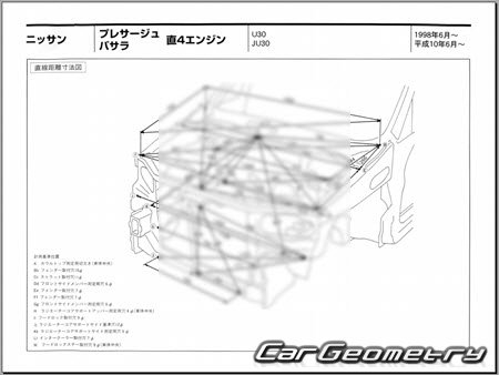 Body dimensions for restoring the body geometry of Nissan Bassara (JU30) 1999-2003 and Nissan Presage (U30) 1997-2003 are used to verify the body geometry and facilitate the subsequent repair of damaged parts. These measurements are specifically applicable to the right-hand drive versions of Nissan Bassara & Presage for the Japanese market.