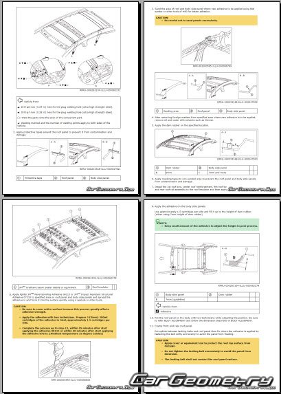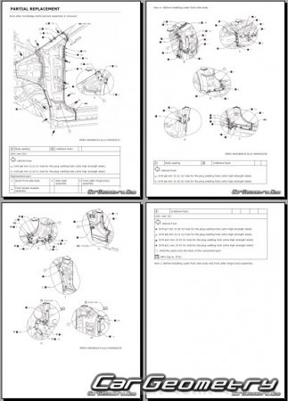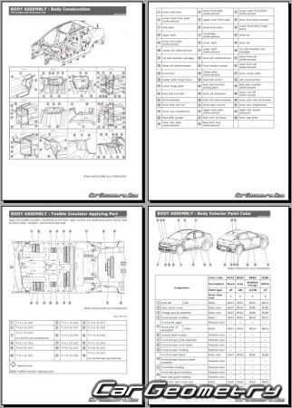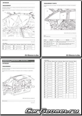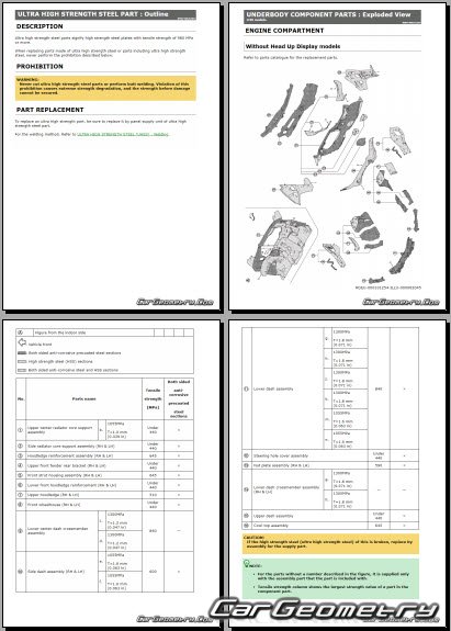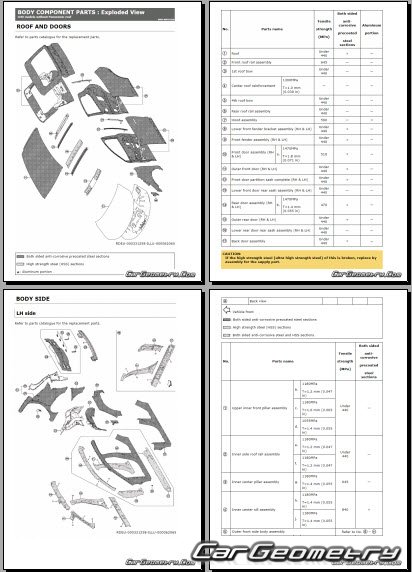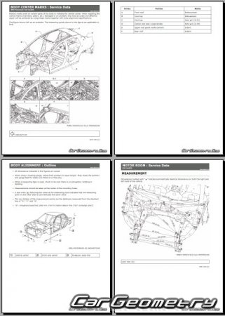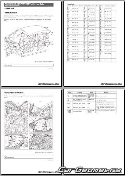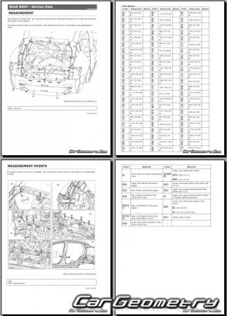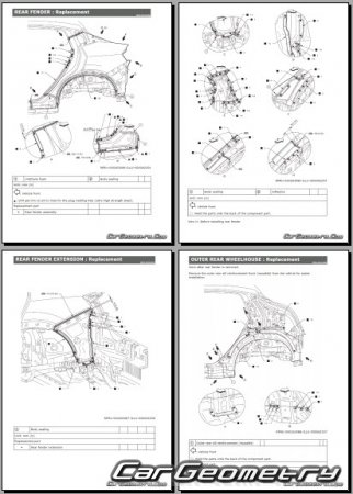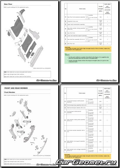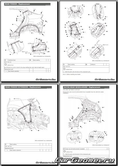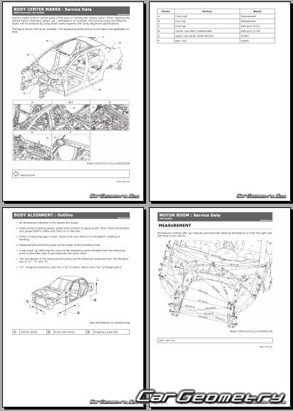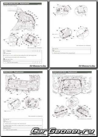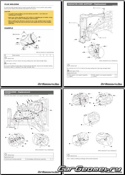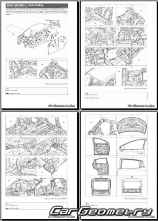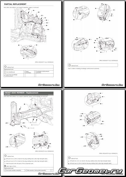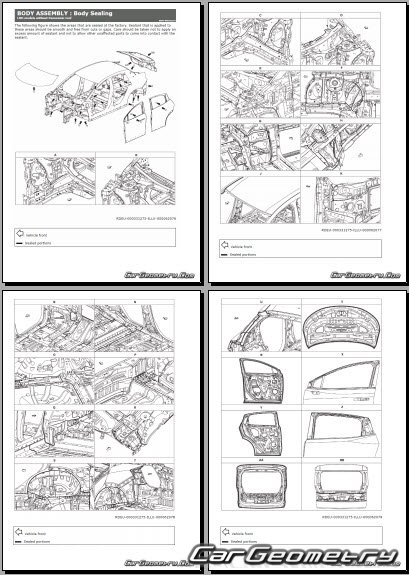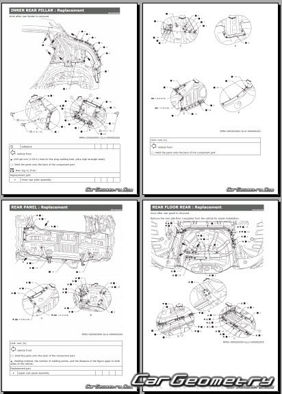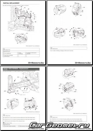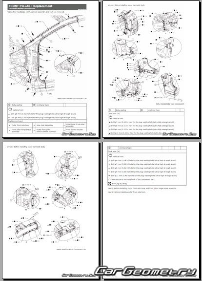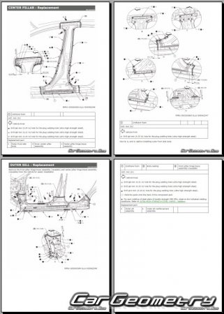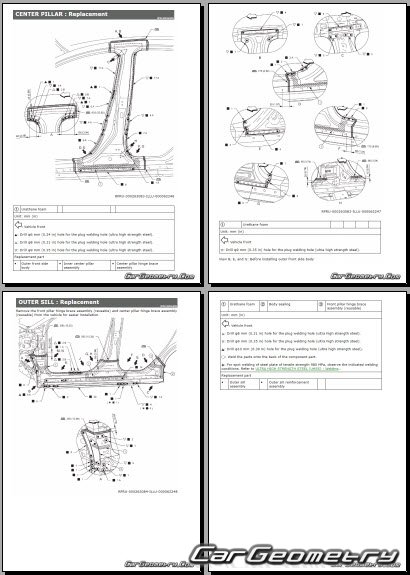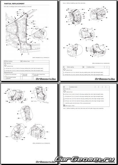 This manual is a valuable resource for body repair technicians and owners involved in the repair process. It covers a wide range of topics, including the replacement of various body components, recommended welding methods and materials, application of sealants and corrosion protection, and cutting procedures for the installation of new body parts.