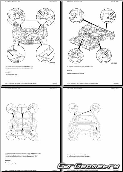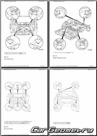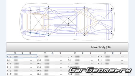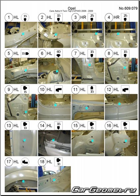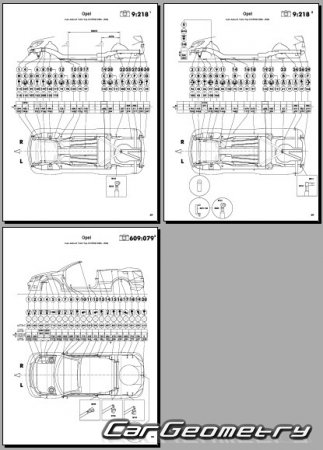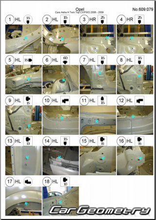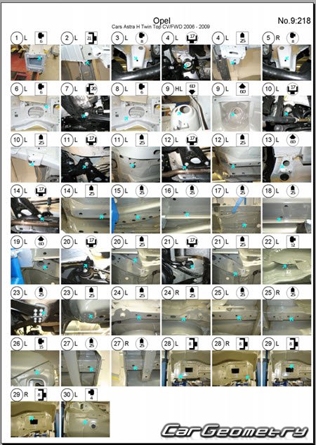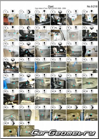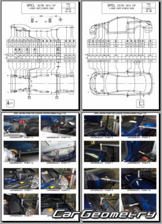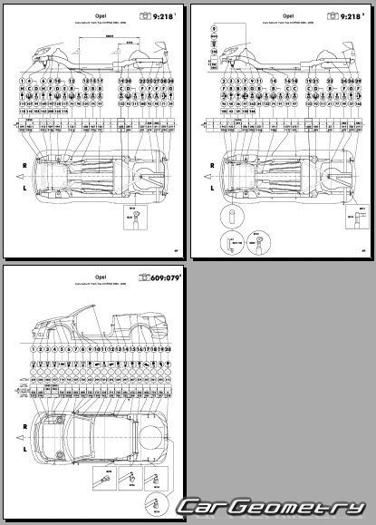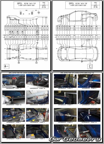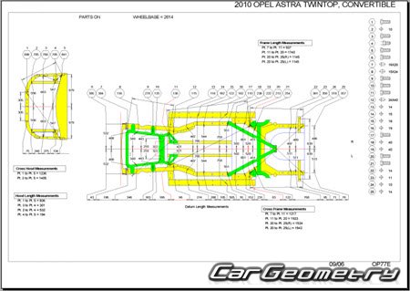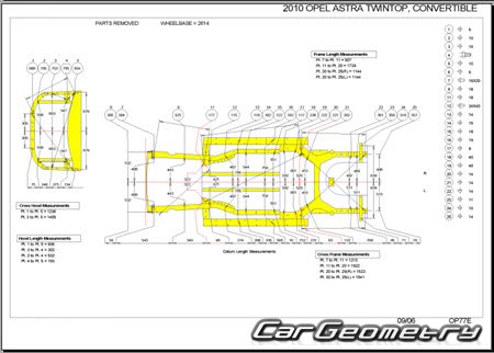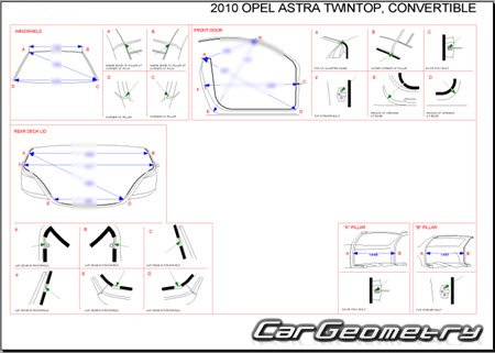 Body dimensions for restoring the body geometry of Opel Astra H TwinTop (L67) 2007-2010. With the help of this information, you can check the geometry of the damaged body, as well as carry out restoration work on the straightening of cars.