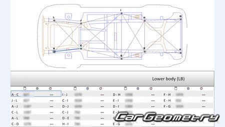 Body dimensions for restoring the body geometry of Opel Antara 2007–2016. With the help of this information, you can check the geometry of the damaged body, as well as carry out restoration work on the straightening of cars. This manual can be used to repair the body of the Saturn Vue 2008-2010.
