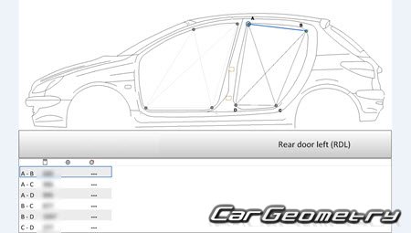 Body dimensions for restoring the body geometry of Peugeot 206 (3DR, 5DR Hatchback) 1998–2009. With the help of this information, you can check the geometry of the damaged body, as well as carry out restoration work on the straightening of cars.