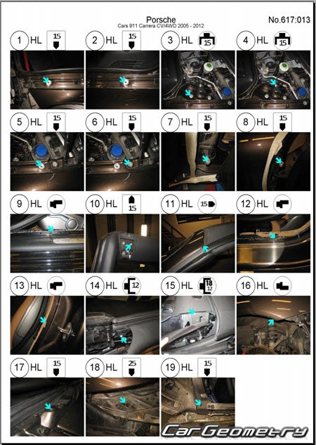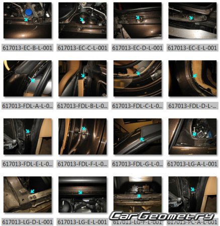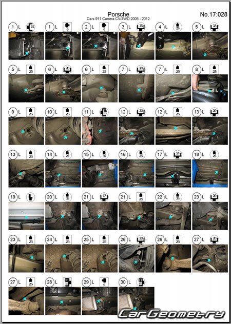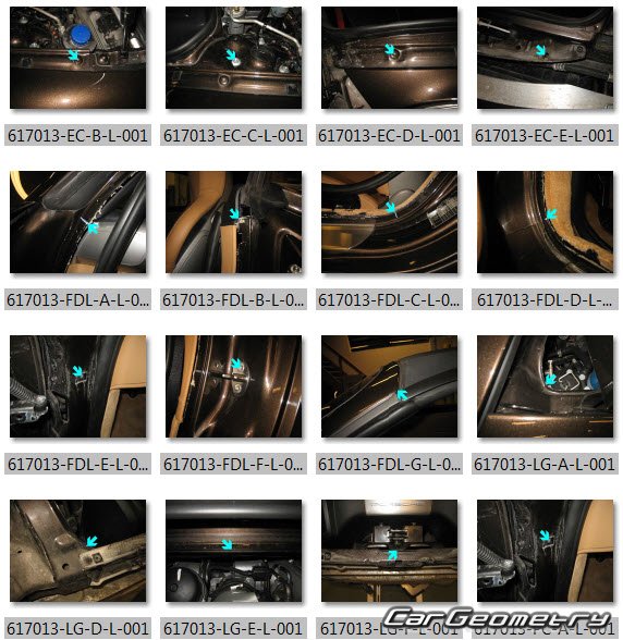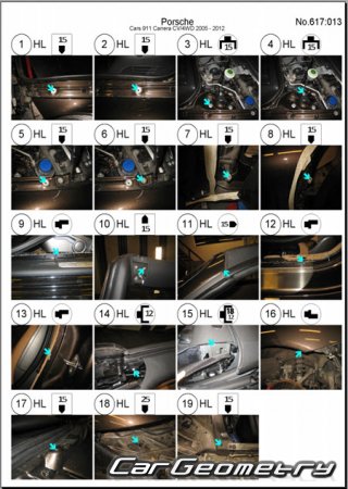 Body dimensions for restoring the body geometry of Porsche 911 Cabriolet (997) 2005–2012. With the help of this information, you can check the geometry of the damaged body, as well as carry out restoration work on the straightening of cars.