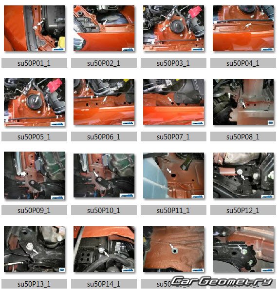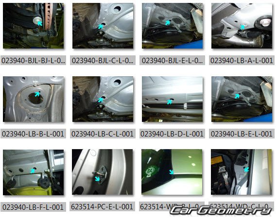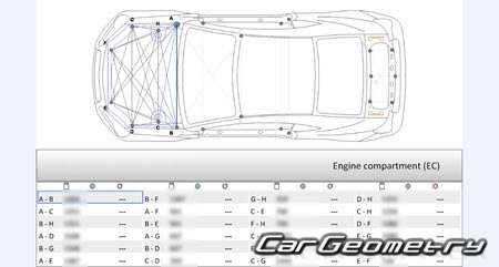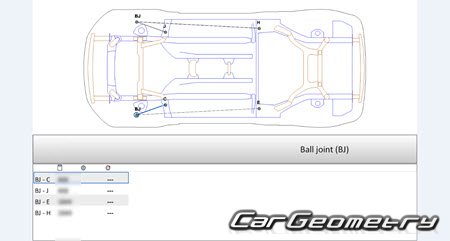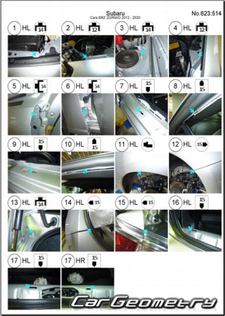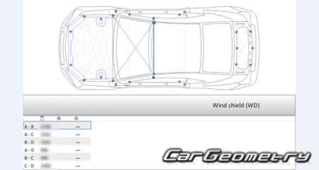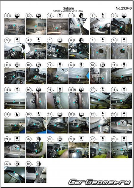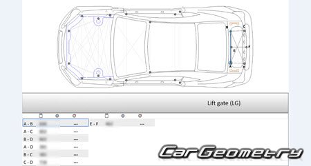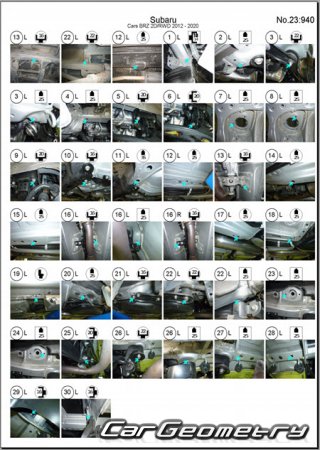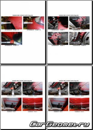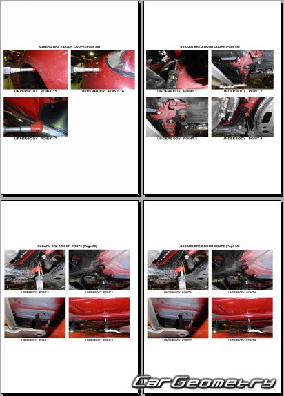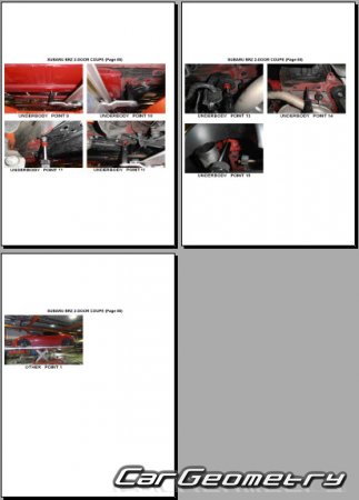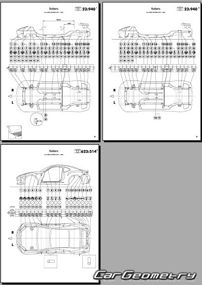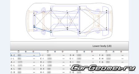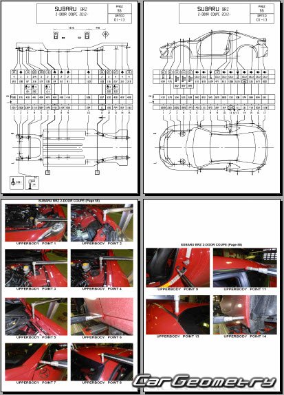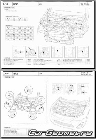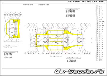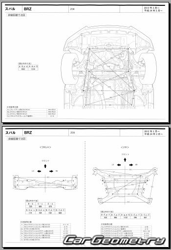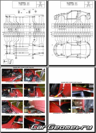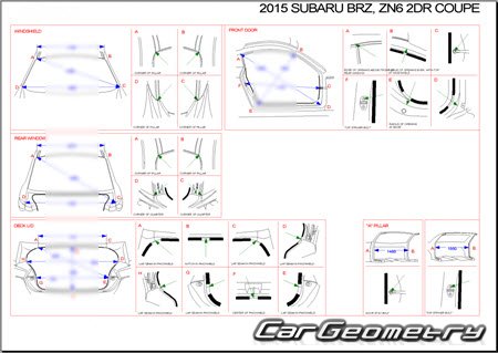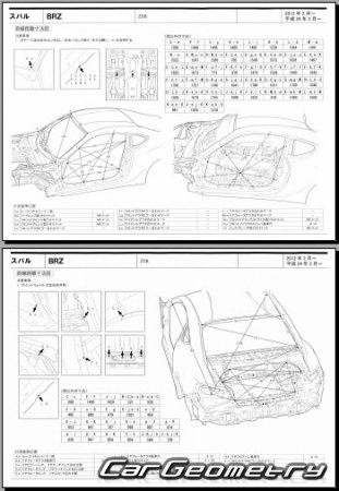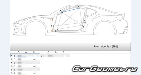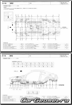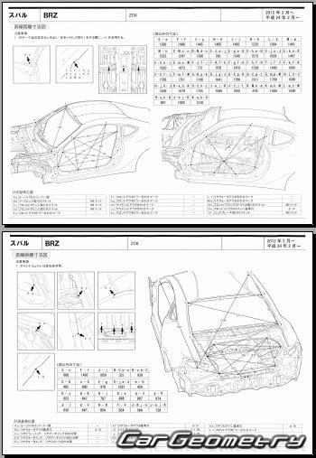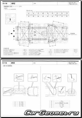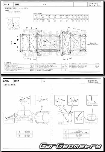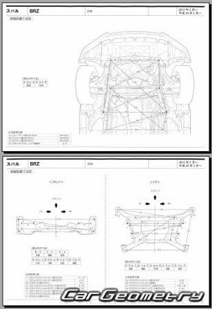 Body dimensions for restoring the body geometry of Subaru BRZ (ZC6) 2012-2020 are available. These data are used to verify the body geometry and perform the necessary straightening of damaged parts for Subaru BRZ right-hand drive vehicles intended for the Japanese market.