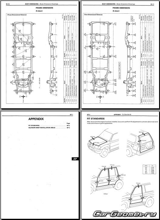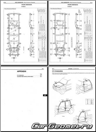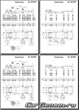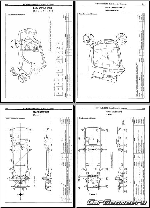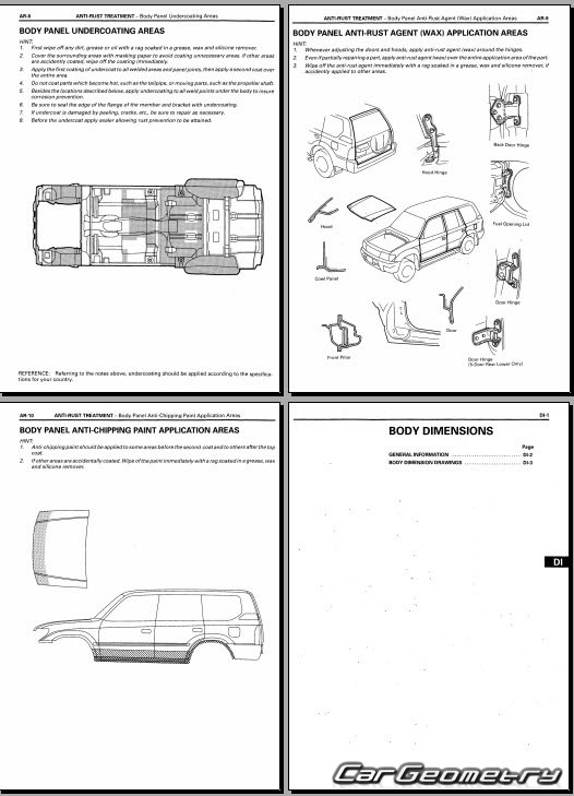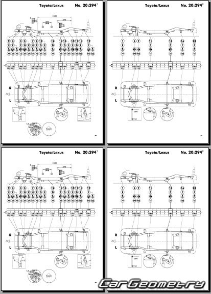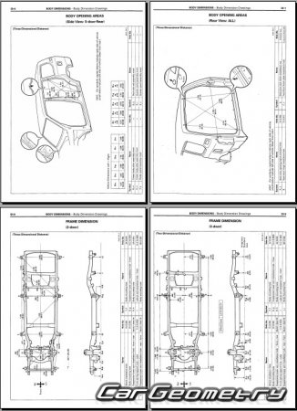 Body dimensions for restoring the body geometry of Toyota Land Cruiser Prado 90 (KDJ9# KZJ9# RZJ9# VZJ9#) 1996–2003. With the help of this information, you can check the geometry of the damaged body, as well as carry out restoration work on the straightening of cars.