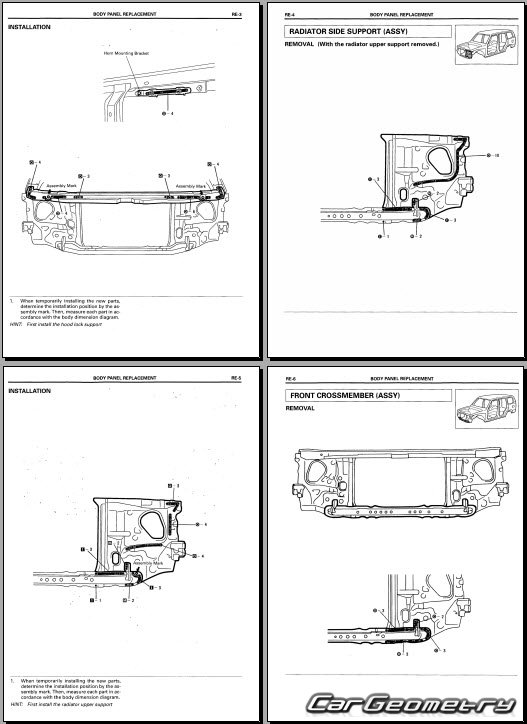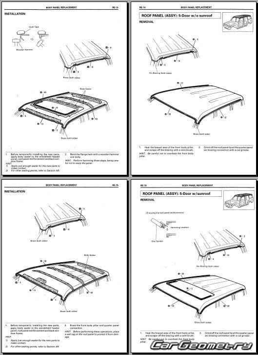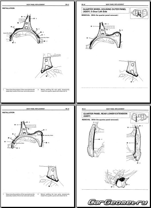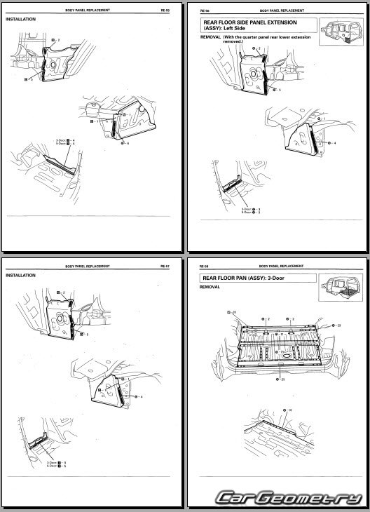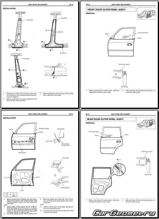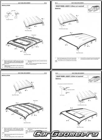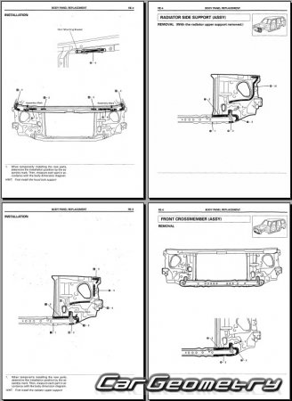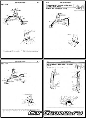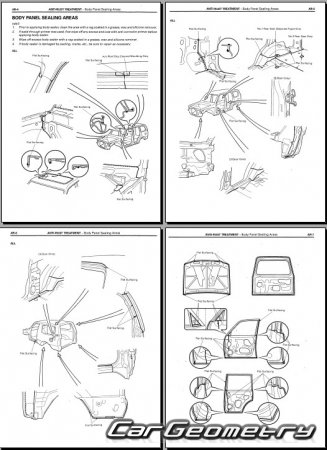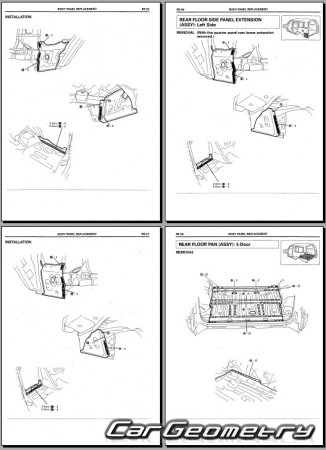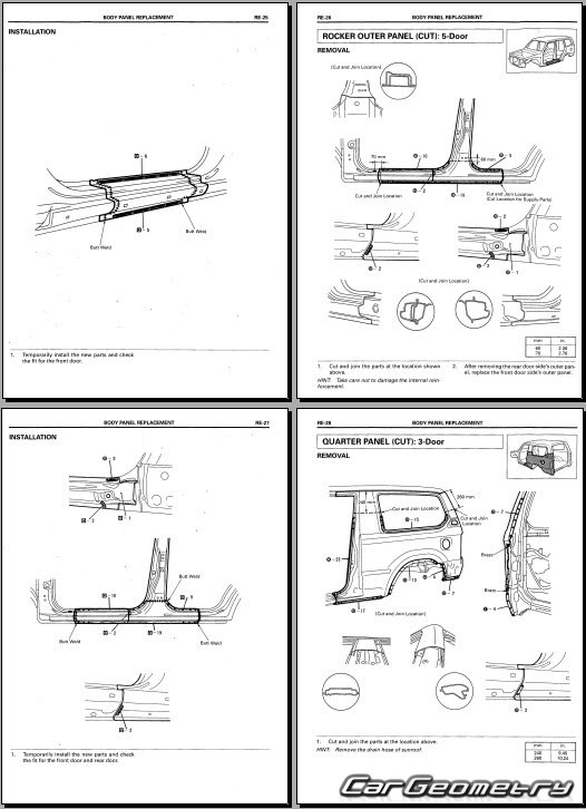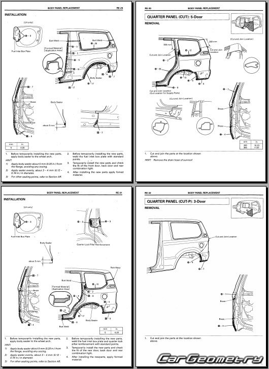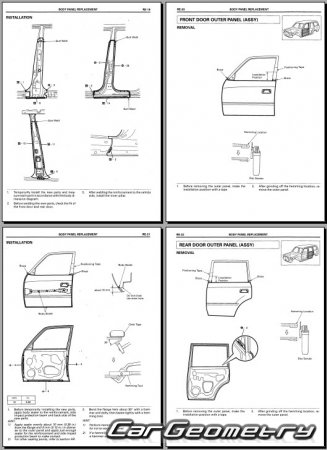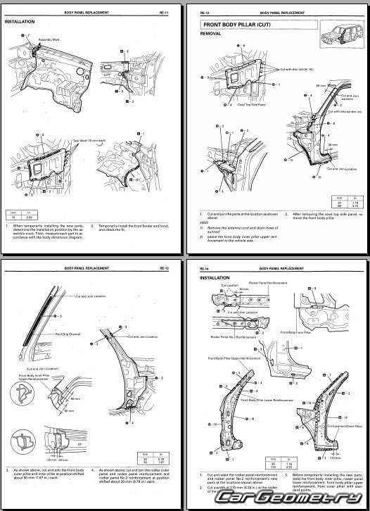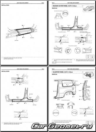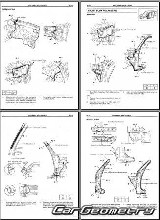 The manual features diagrams and illustrations that depict cross-sections of body elements, aiding in visualizing the structural composition and facilitating the repair process. It also covers cutting procedures and directions for removing and installing new body components, ensuring accurate and efficient repairs.