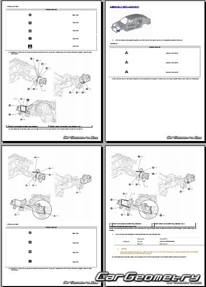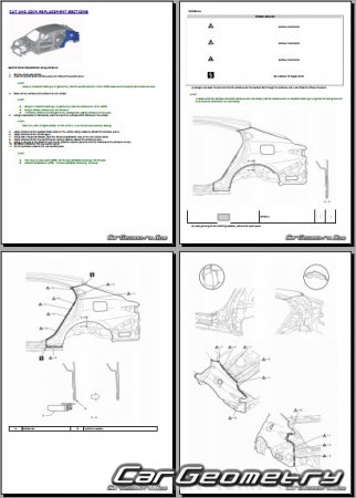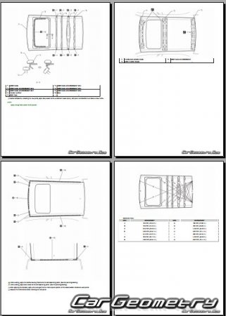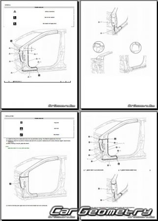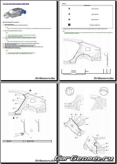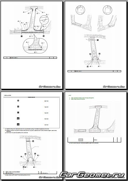 The manual features diagrams and illustrations that depict cross-sections of body elements, aiding in visualizing the structural composition and facilitating the repair process. It also covers cutting procedures and directions for removing and installing new body components, ensuring accurate and efficient repairs.