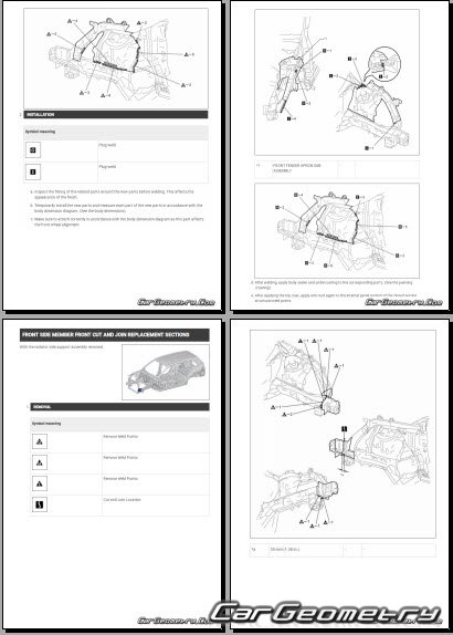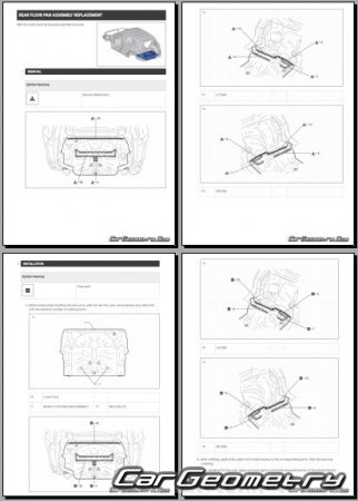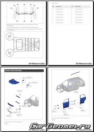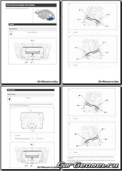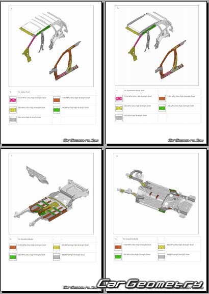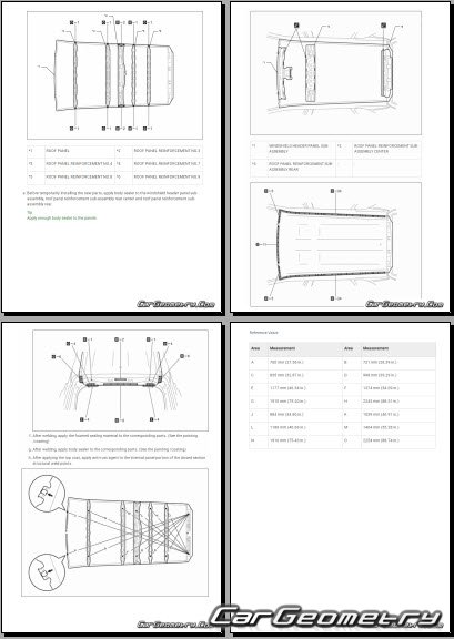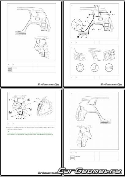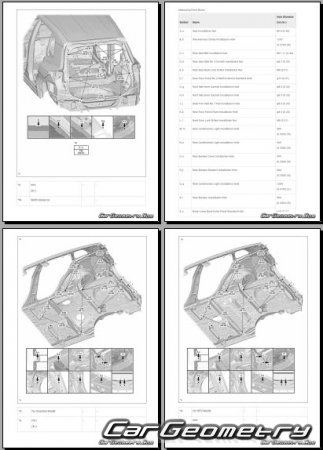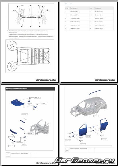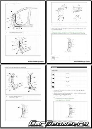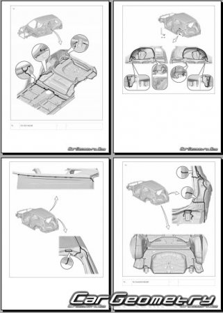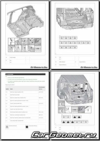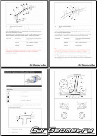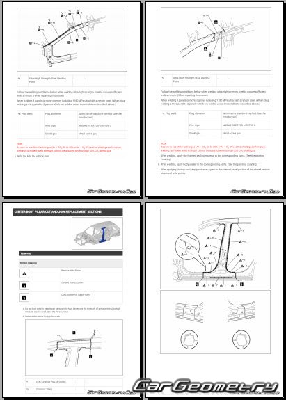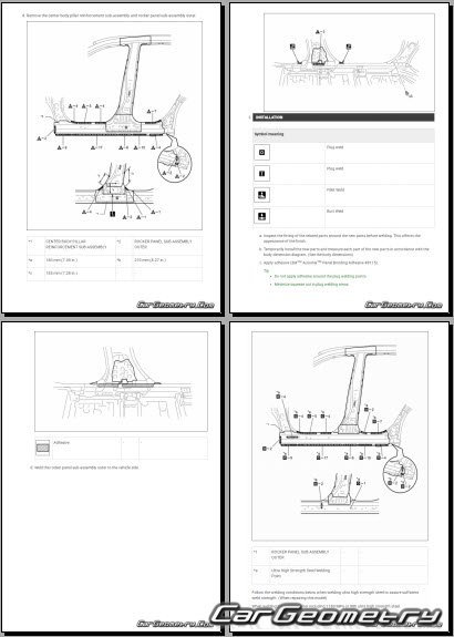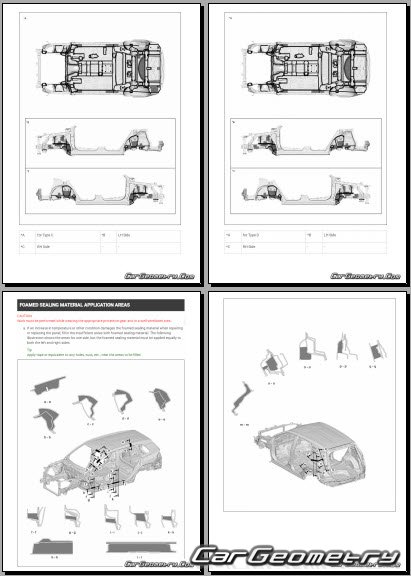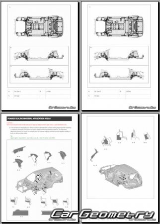 The manual may also provide recommendations for welding methods, materials, and locations, as well as guidelines for applying seam sealer, soundproofing materials, and anti-corrosion coatings. It may contain information about interior materials, their types, and decoding information as well.