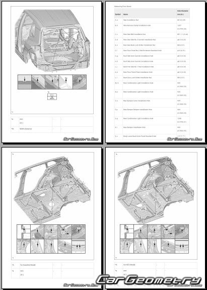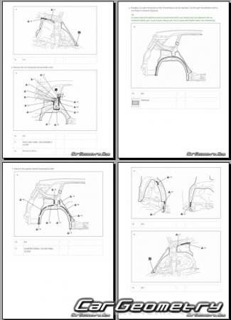Information for the Toyota RAV4 2026-2031 body geometric dimensions, control points, images of body elements, materials used, recommendations on applicable types, methods and materials for the welding points; places and materials for applying seam, soundproof and anti-corrosion sealants; points and directions for pre-cuts of body parts for the future installation of the new ones; types of interior materials, definitions and decoding.