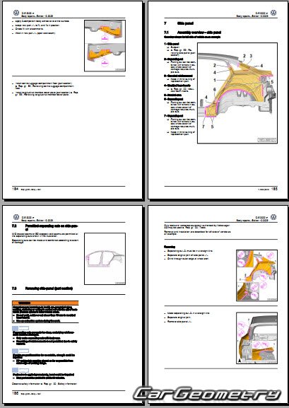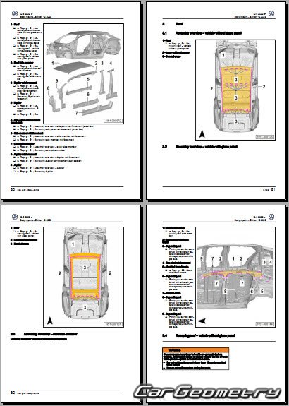 Information for the Volkswagen ID.5 2022-2027 body geometric dimensions, control points, images of body elements, materials used, recommendations on applicable types, methods and materials for the welding points; places and materials for applying seam, soundproof and anti-corrosion sealants; points and directions for pre-cuts of body parts for the future installation of the new ones; types of interior materials, definitions and decoding.