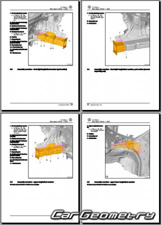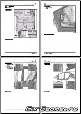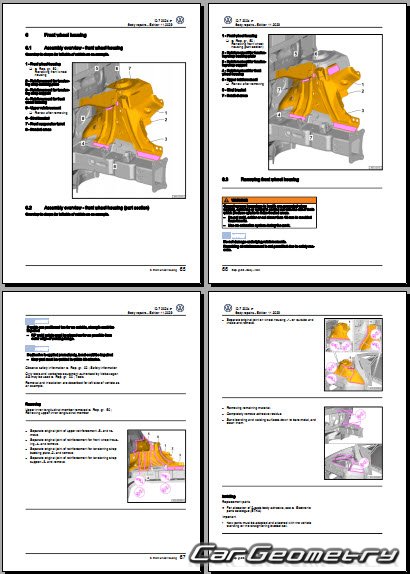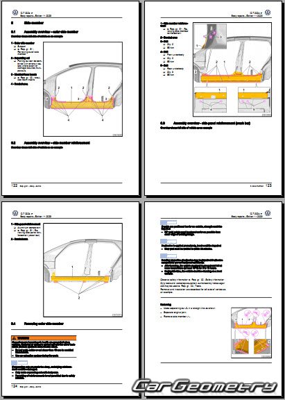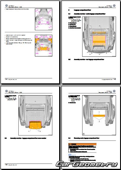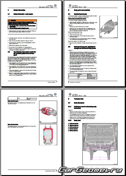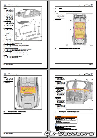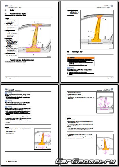 The manual features diagrams and illustrations that depict cross-sections of body elements, aiding in visualizing the structural composition and facilitating the repair process. It also covers cutting procedures and directions for removing and installing new body components, ensuring accurate and efficient repairs.