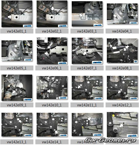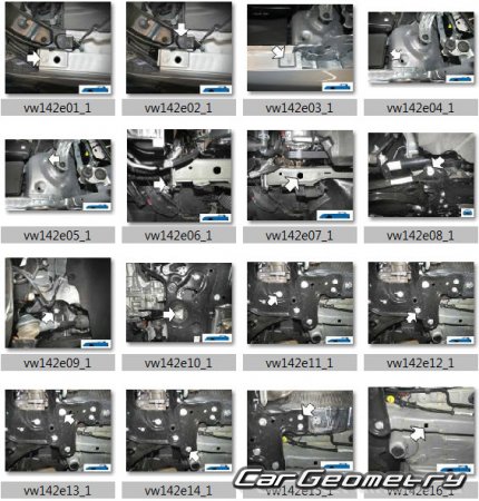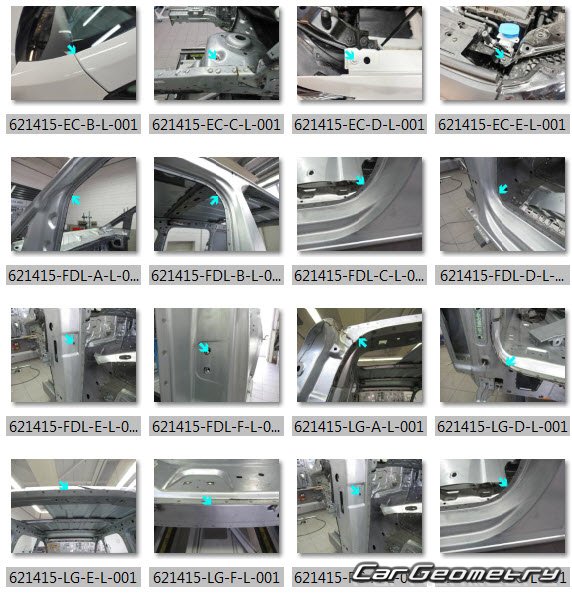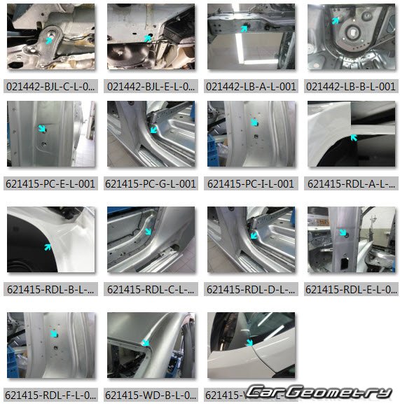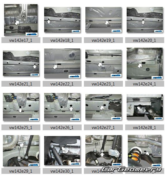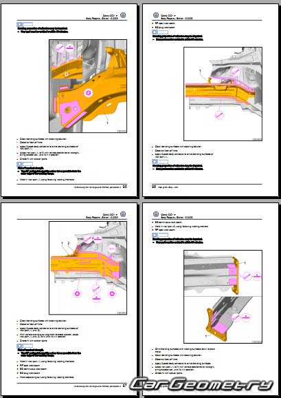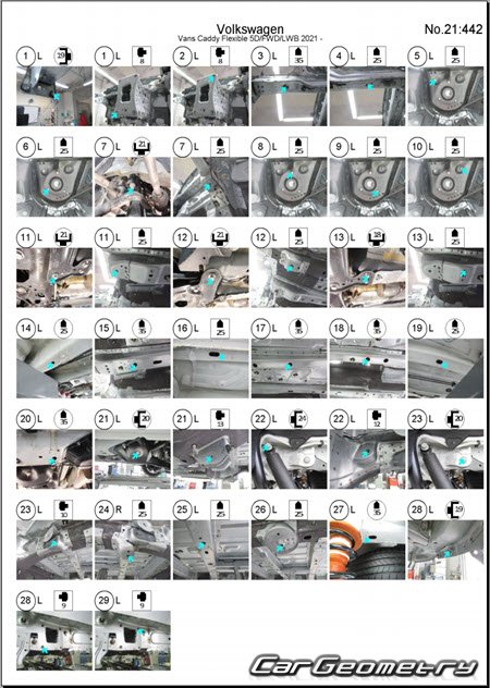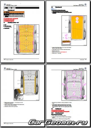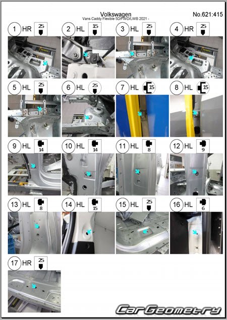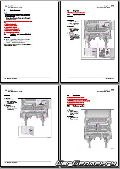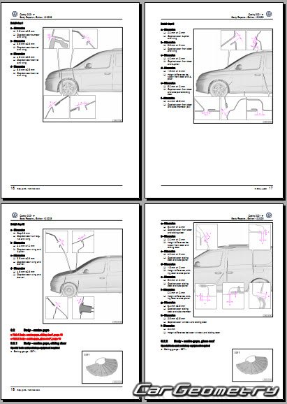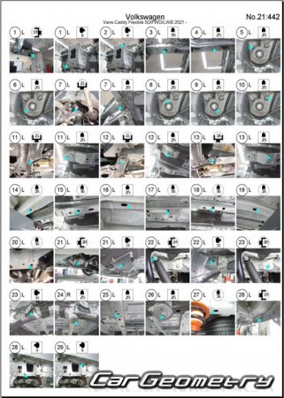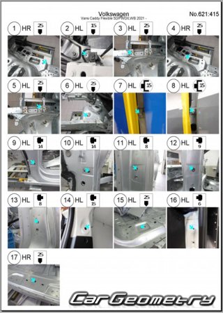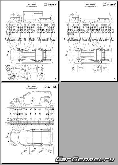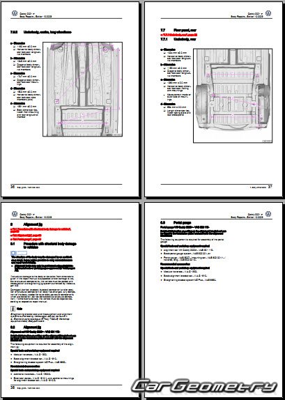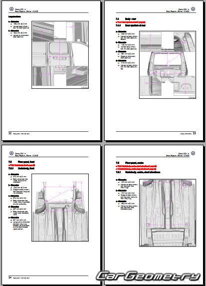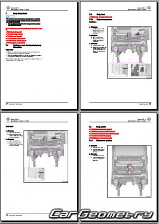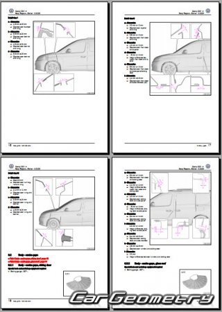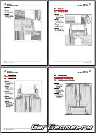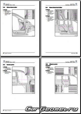 Information for the Volkswagen Caddy (SWB LWB) body geometric dimensions, control points, images of body elements, materials used, recommendations on applicable types, methods and materials for the welding points; places and materials for applying seam, soundproof and anti-corrosion sealants; points and directions for pre-cuts of body parts for the future installation of the new ones; types of interior materials, definitions and decoding.