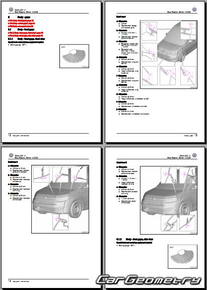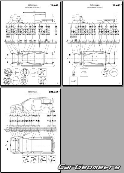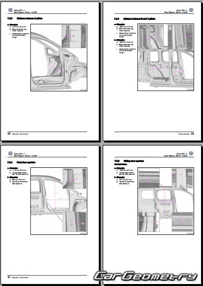 The factory body repair manual contains body dimensions for the Volkswagen Caddy (SWB LWB) 2021-2028 and includes description of various body parts replacement, body dimension, control points for the VW Caddy.