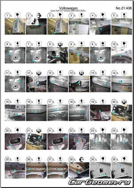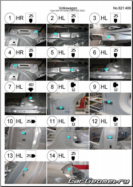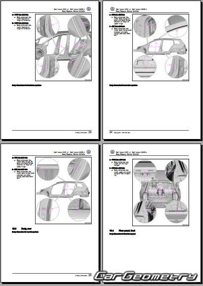 The factory body repair manual contains body dimensions for the Volkswagen Golf Variant 2021-2026 and includes description of various body parts replacement, body dimension, control points for the VW Golf Variant.
