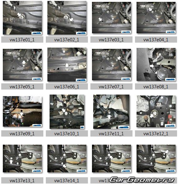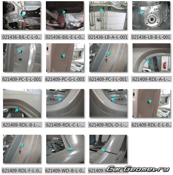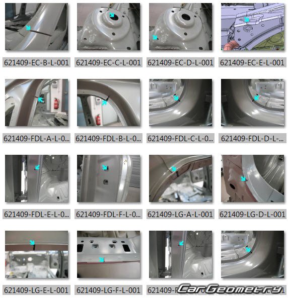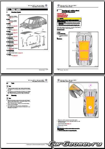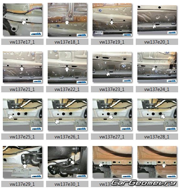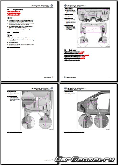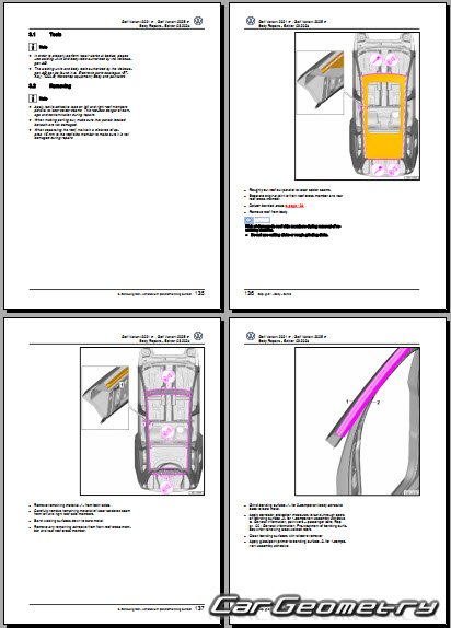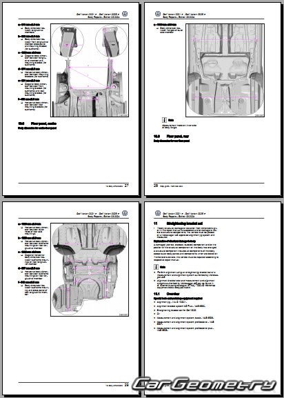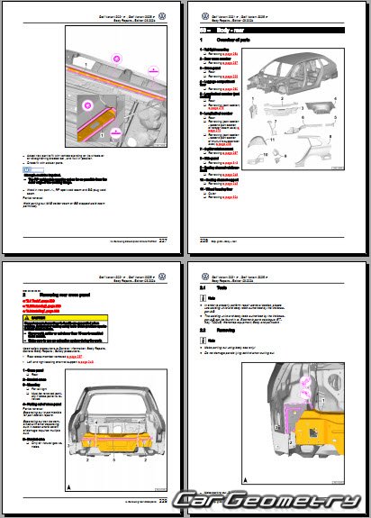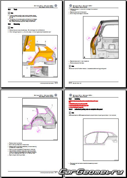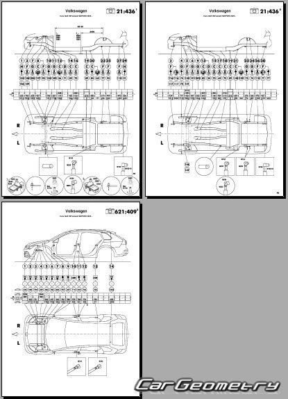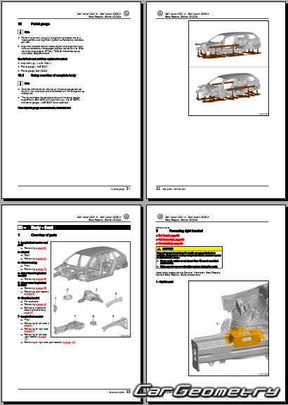 Information for the VW Golf Variant body geometric dimensions, control points, images of body elements, materials used, recommendations on applicable types, methods and materials for the welding points; places and materials for applying seam, soundproof and anti-corrosion sealants; points and directions for pre-cuts of body parts for the future installation of the new ones; types of interior materials, definitions and decoding.