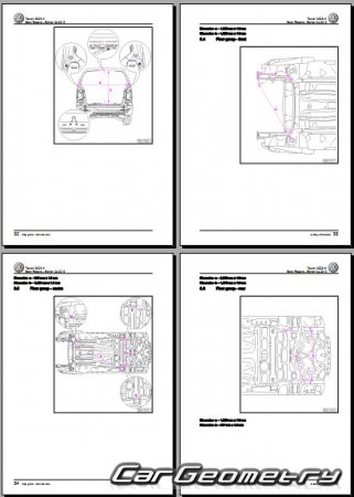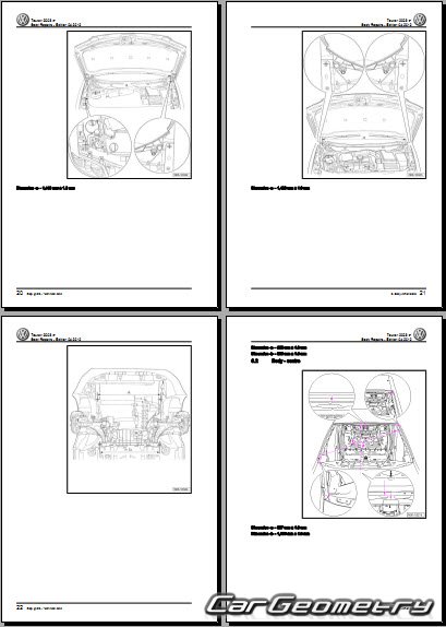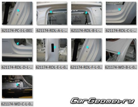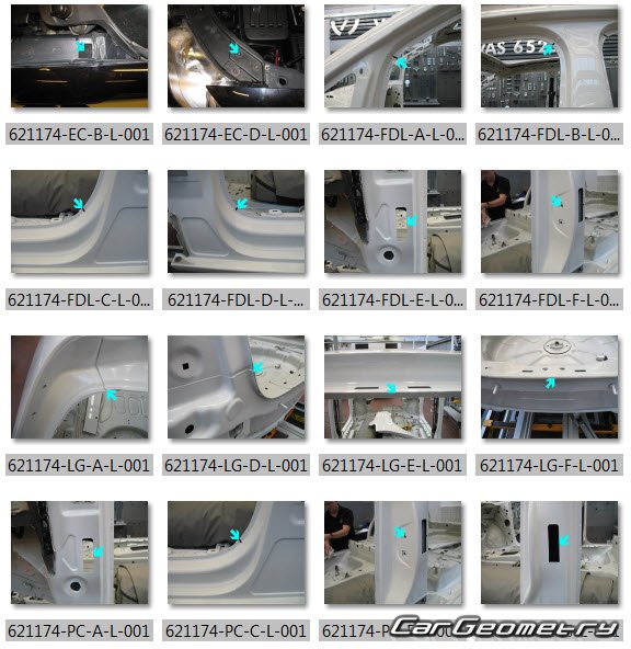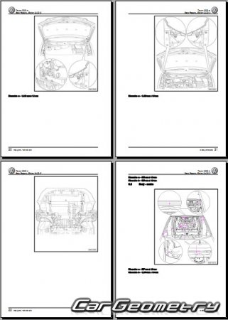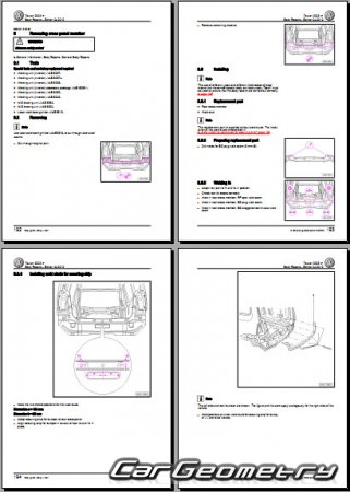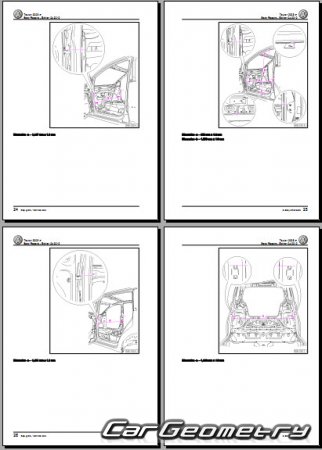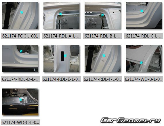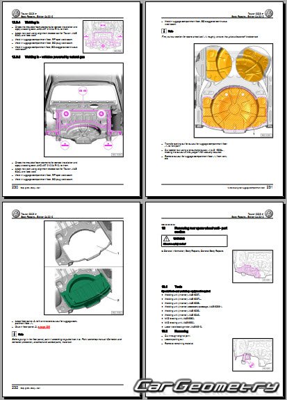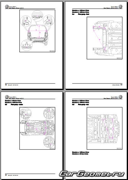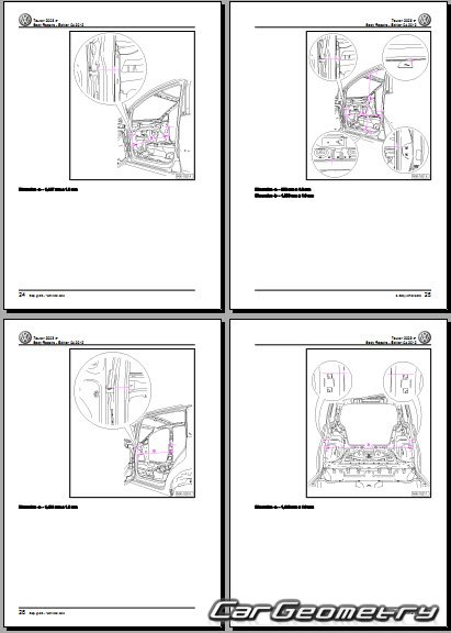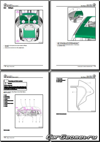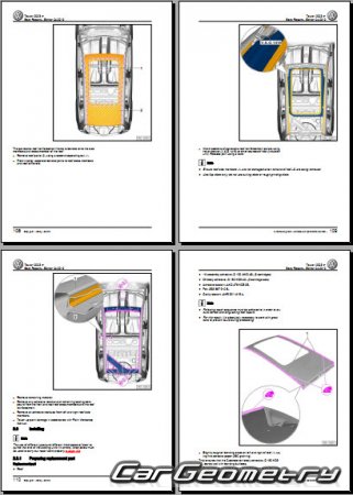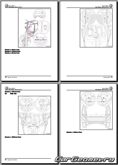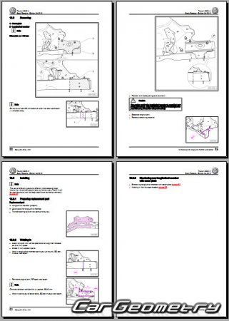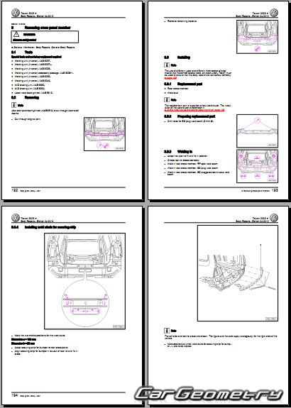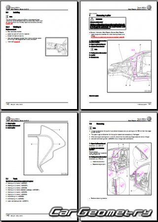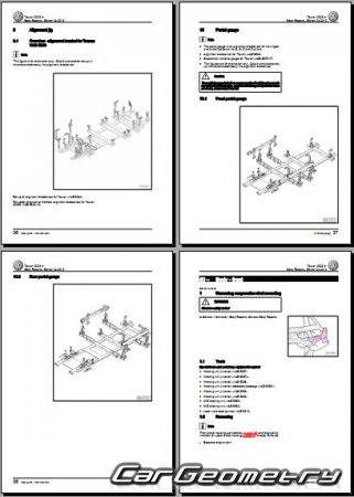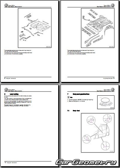 Information for the VW Touran 2003-2010 body geometric dimensions, control points, images of body elements, materials used, recommendations on applicable types, methods and materials for the welding points; places and materials for applying seam, soundproof and anti-corrosion sealants; points and directions for pre-cuts of body parts for the future installation of the new ones; types of interior materials, definitions and decoding.