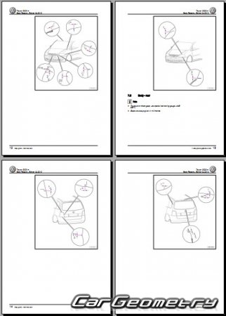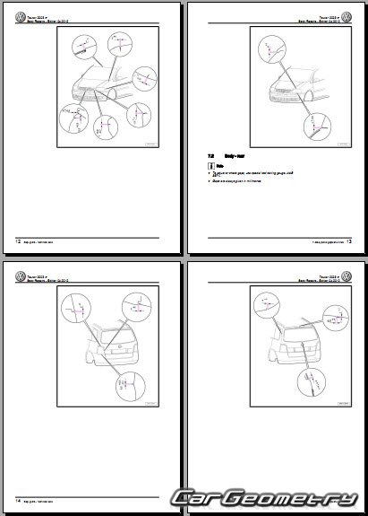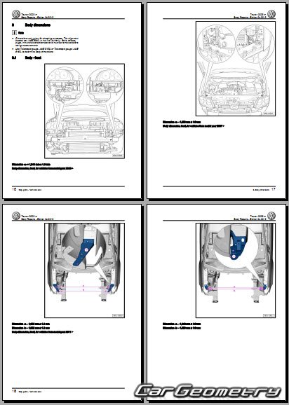 The factory body repair manual contains body dimensions for the Volkswagen Touran (1T1, 1T2) 2003-2010 and includes description of various body parts replacement, body dimension, control points for the VW Touran.