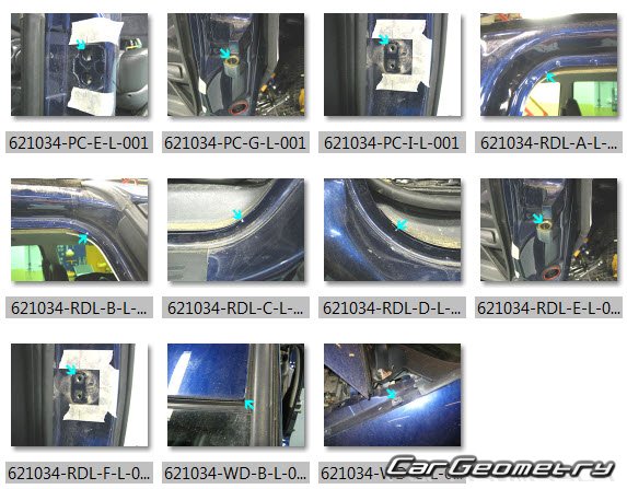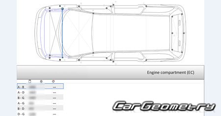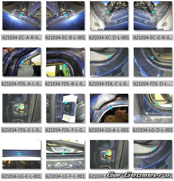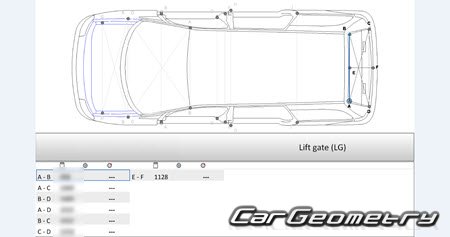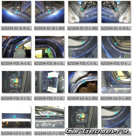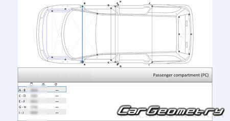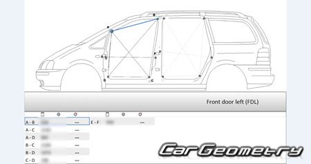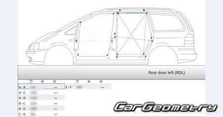Information for the VW Sharan 2004-2010 body geometric dimensions, control points, images of body elements, materials used, recommendations on applicable types, methods and materials for the welding points; places and materials for applying seam, soundproof and anti-corrosion sealants; points and directions for pre-cuts of body parts for the future installation of the new ones; types of interior materials, definitions and decoding.