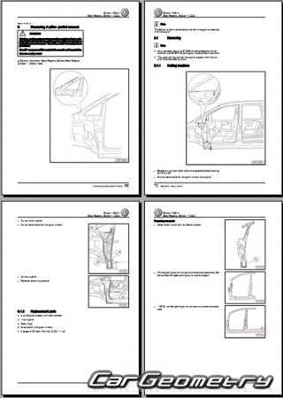The factory body repair manual contains body dimensions for the Volkswagen Sharan (Typ 7M) 2004-2010 and includes description of various body parts replacement, body dimension, control points for the VW Sharan.