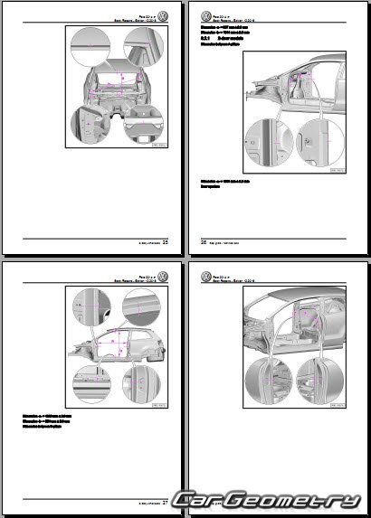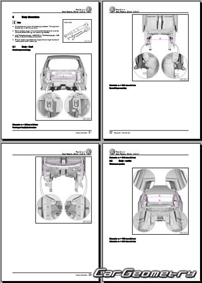 The factory body repair manual contains body dimensions for the Volkswagen Polo (Typ 6R) 2009–2018 and includes description of various body parts replacement, body dimension, control points for the VW Polo.