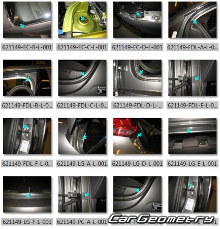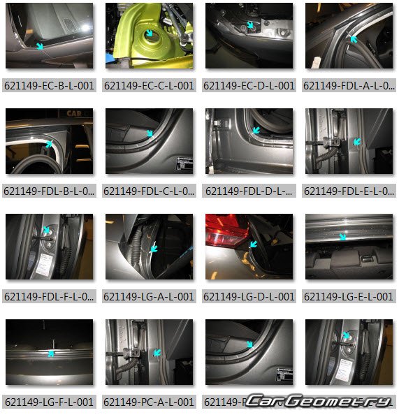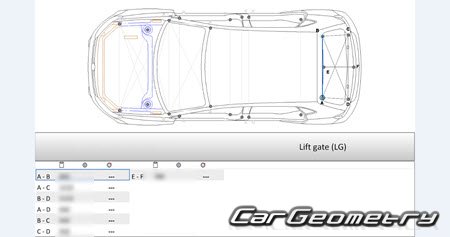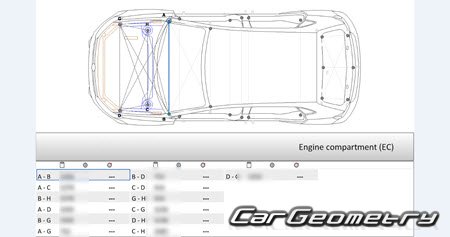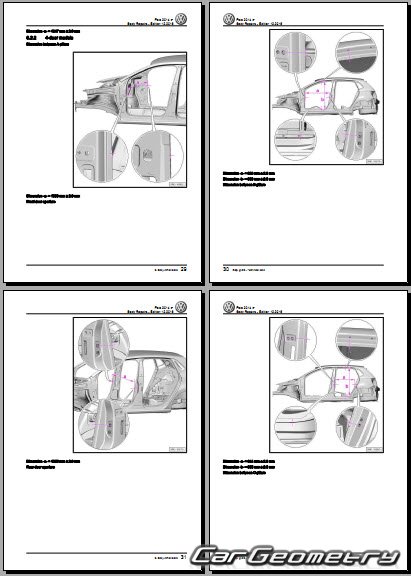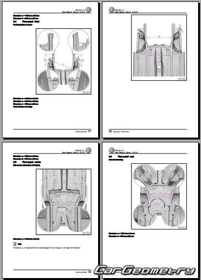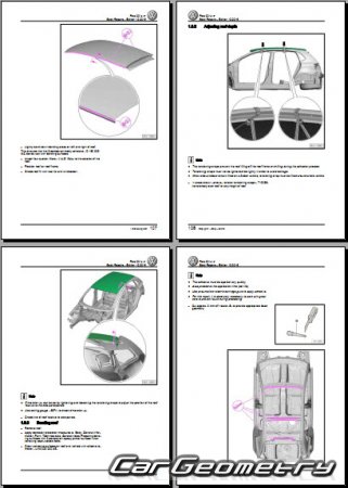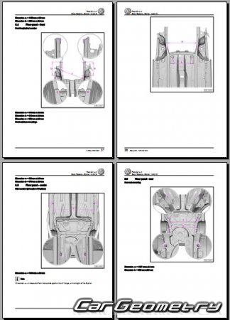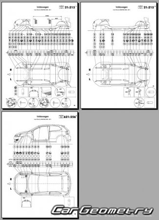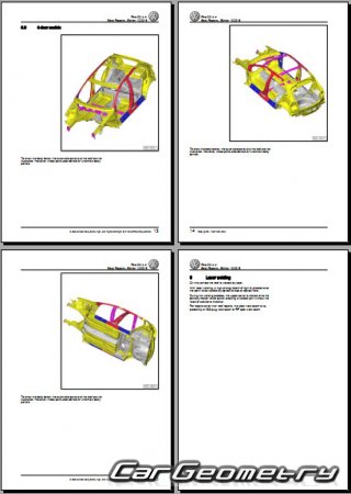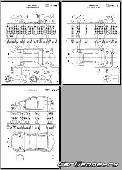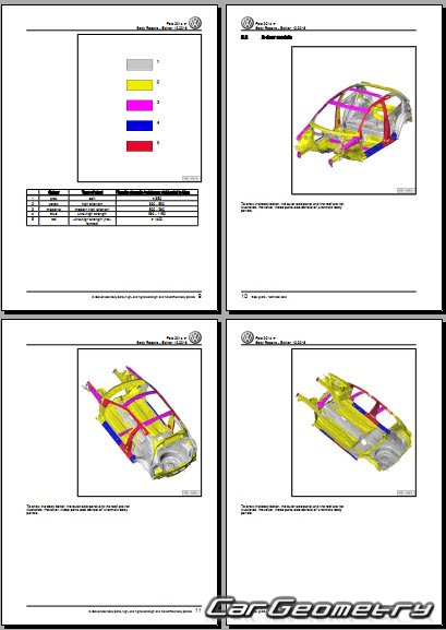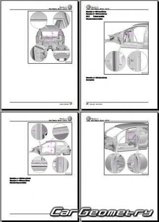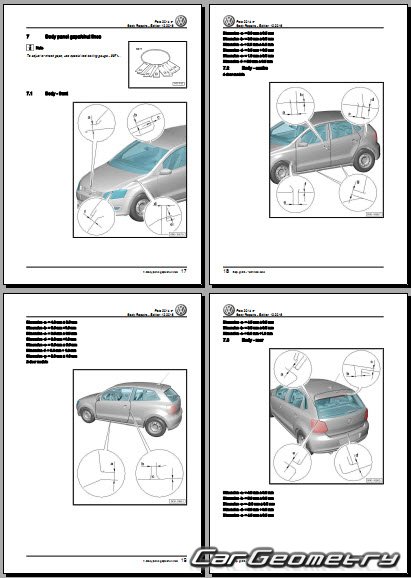 Information for the VW Polo 2009–2018 body geometric dimensions, control points, images of body elements, materials used, recommendations on applicable types, methods and materials for the welding points; places and materials for applying seam, soundproof and anti-corrosion sealants; points and directions for pre-cuts of body parts for the future installation of the new ones; types of interior materials, definitions and decoding.