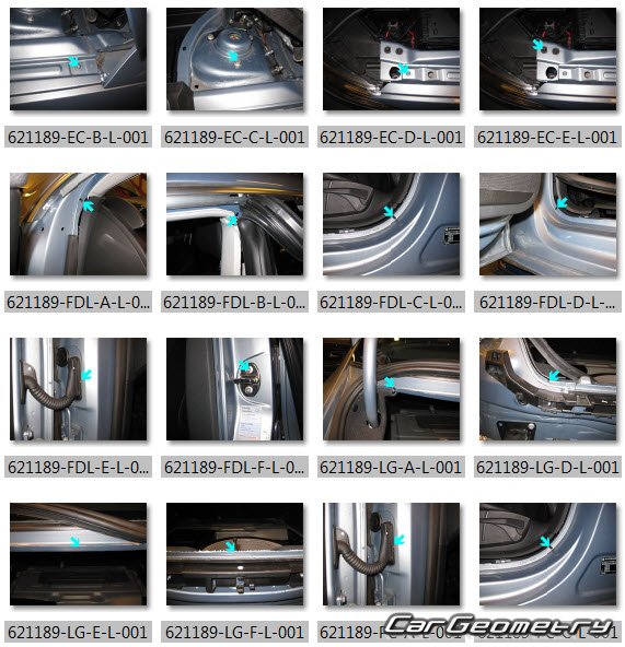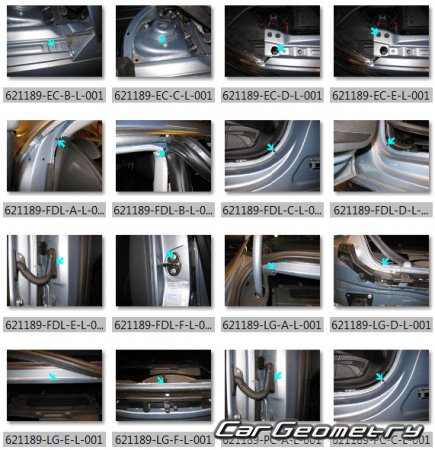Information for the VW CC 2008-2012 body geometric dimensions, control points, images of body elements, materials used, recommendations on applicable types, methods and materials for the welding points; places and materials for applying seam, soundproof and anti-corrosion sealants; points and directions for pre-cuts of body parts for the future installation of the new ones; types of interior materials, definitions and decoding.