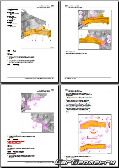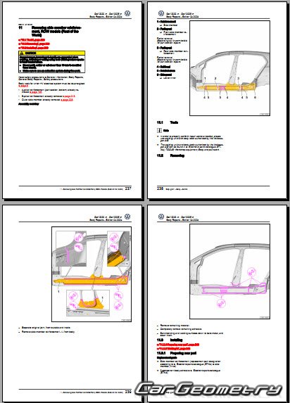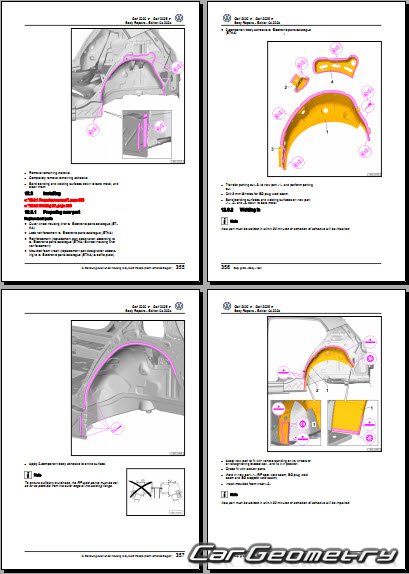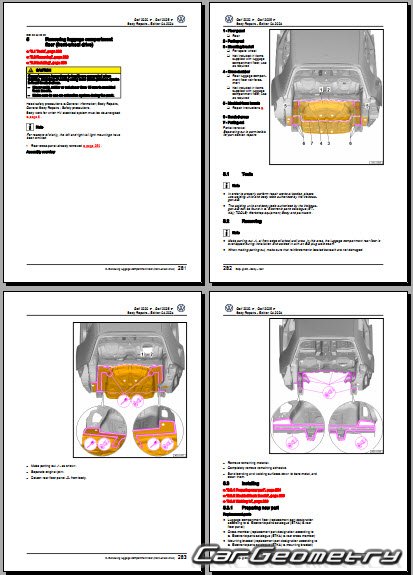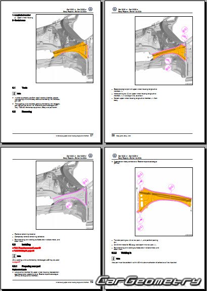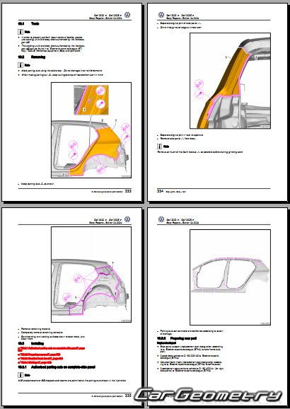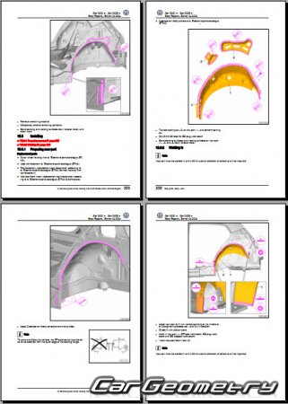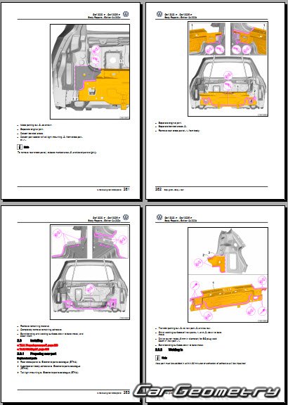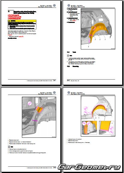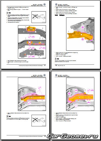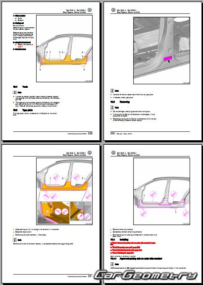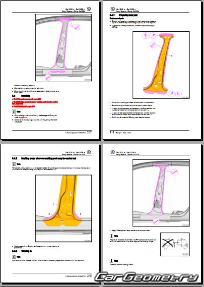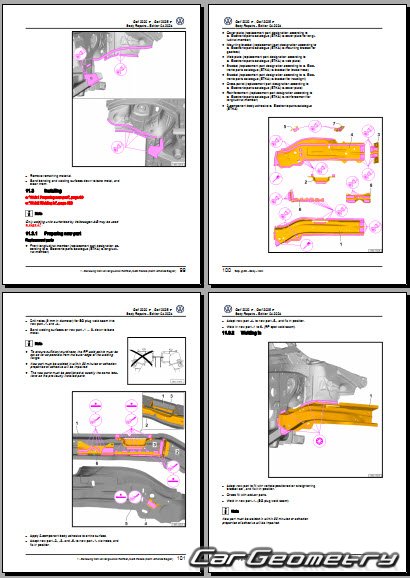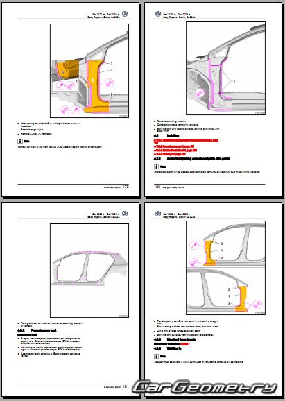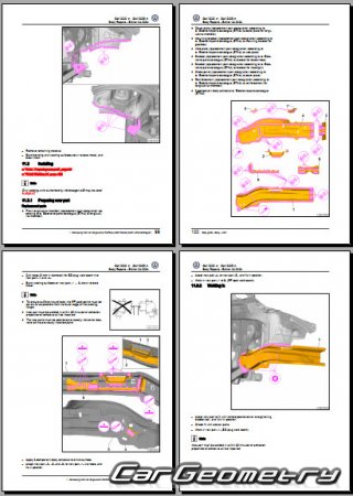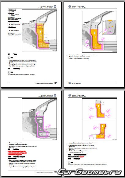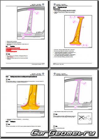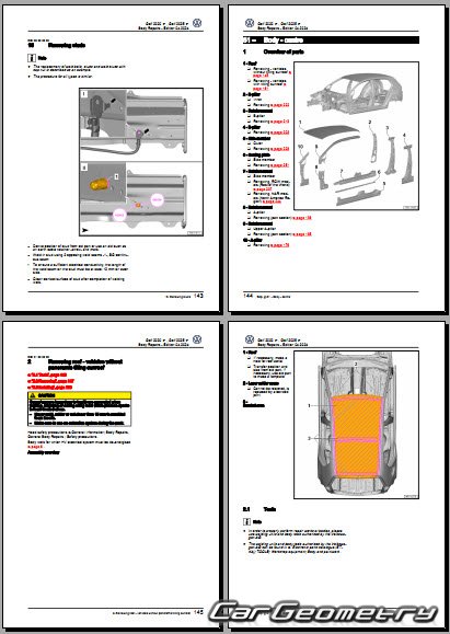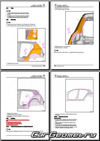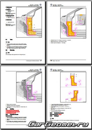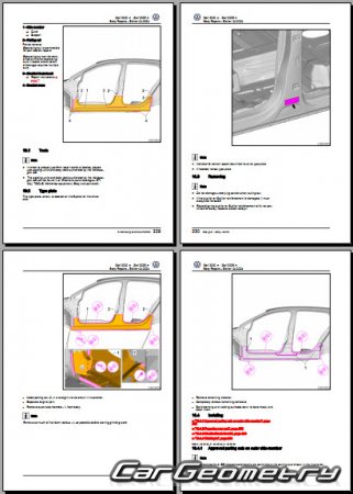 Information for the VW Golf 2020-2026 body geometric dimensions, control points, images of body elements, materials used, recommendations on applicable types, methods and materials for the welding points; places and materials for applying seam, soundproof and anti-corrosion sealants; points and directions for pre-cuts of body parts for the future installation of the new ones; types of interior materials, definitions and decoding.