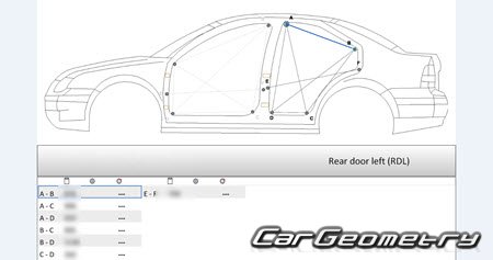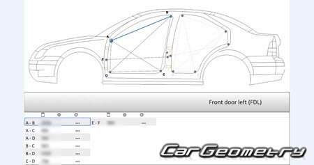 Information for the Volkswagen Jetta 1999–2005 body geometric dimensions, control points, images of body elements, materials used, recommendations on applicable types, methods and materials for the welding points; places and materials for applying seam, soundproof and anti-corrosion sealants; points and directions for pre-cuts of body parts for the future installation of the new ones; types of interior materials, definitions and decoding.